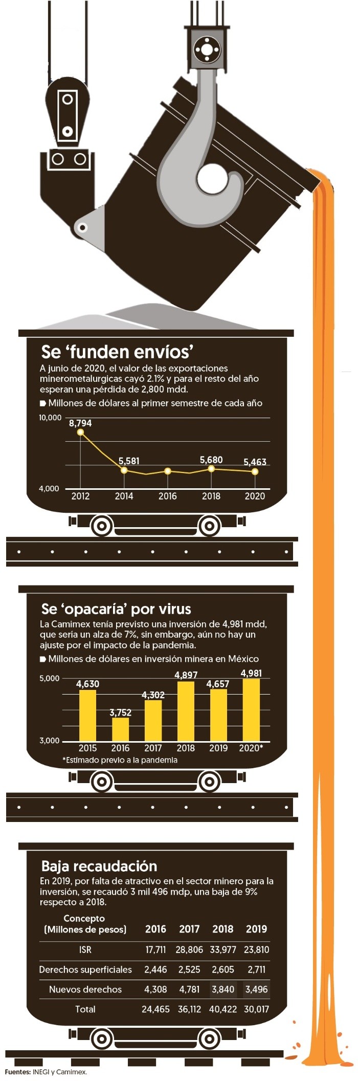 Al cierre de este año, la minería estima que perderá alrededor de 2 mil 800 millones de dólares en el valor de sus exportaciones, derivado de la pandemia del coronavirus que obligó a las empresas a suspender temporalmente actividades por dos meses en México, advirtió Fernando Alanís, presidente de la Cámara Minera de México (Camimex). En conferencia por la presentación del informe anual 2020, el representante de la Camimex señaló que la reducción en los ingresos se debe a la suspensión temporal de labores entre abril y mayo por no ser considerados como industria esencial al inicio de la emergencia sanitaria, lo que provocó que perdieran 2 mil millones de dólares en producción. “La minería estuvo parada por dos meses y eso generó una pérdida en producción estimada de 2 mil millones de dólares, y en cuestión de generación de divisas por exportación fue de 2 mil 800 millones de dólares (…) No vemos que esto se pueda recuperar en lo que resta del año, ayudará un poco la recuperación de los precios de los metales, pero no vemos que esto pueda cambiarlo”, explicó. Entre enero y junio de 2020, el valor de las exportaciones minero metalúrgicas fue de 5 mil 462 millones de dólares, una reducción de 2.1 por ciento en comparación con lo reportado en igual lapso del año pasado, siendo la mayor caída en cuatro años, de acuerdo con INEGI. “Vimos un aumento en el precio de los metales como oro y plata, y eso ayuda, pero en el corto plazo, necesitamos que el gobierno apoye con políticas públicas para el desarrollo a largo plazo del sector”, agregó Alanís.Invertirán 7% más este año El presidente de Camimex adelantó que las empresas afiliadas estimaron invertir 4 mil 981 millones de dólares este 2020, lo que significaría un aumento de casi 7 por ciento comparado con lo reportado en 2019. “Sin embargo, estas cifras son respecto a lo que veían en diciembre, la pandemia de coronavirus COVID-19 modificó sus planes, aunque no espero que mucho porque la industria se mueve en proyectos de largo plazo (…) más adelante se irá informando de cuánto cambió la inversión”, comentó. Sin embargo, destacó que desde 2019 se redujo la inversión minera en México 4.9 por ciento con respecto a un año antes por la falta de certeza jurídica, seguridad y una política pública por parte del gobierno para motivar la inversión en el sector. Esto también se reflejó en la inyección de capital destinado a exploración, que bajó 37 por ciento en los últimos seis años. “Contando con las políticas necesarias que fomenten la certeza jurídica, la seguridad y un régimen fiscal adecuado, el sector podría invertir 24 mil 200 millones de dólares en los próximos seis años, y con ello crecer 5 puntos porcentuales la participación de la minería en el Producto Interno Bruto (PIB)”, dijo el también director general de Industrias Peñoles. Señaló que en 2019 la minería representó 2.3 por ciento del PIB nacional, pero si se impulsa al sector podría crecer su aportación a 3 por ciento. Cae 9% recaudación minera En 2019, las mineras pagaron 3 mil 496 millones de pesos por derechos al Fondo Minero, una caída de 9 por ciento frente a lo recaudado en 2018, informó la Camimex. Fernando Alanís, presidente de la agrupación, señaló que esto puede ser por una menor actividad en el sector por la falta de atractivo en inversión que tiene el país. “México perdió atractivo de inversión en minería, algunos proyectos han tomado la decisión con la pandemia de posponer sus proyectos de exploración”, destacó. A pesar de ello, refirió que la minería es de los sectores más regulados, pues cuenta con mil 77 marcos regulatorios que debe cumplir, desde laborales, fiscales, salud, seguridad, entre otros. En promedio se tiene una carga fiscal de 51 por ciento sobre la actividad minera, al ser de los sectores más regulados, dijo.