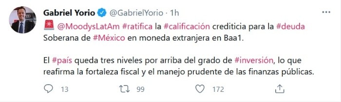 Moody's reafirmó las calificaciones de emisor de largo plazo en moneda extranjera y moneda local del gobierno de México en Baa1, manteniendo la perspectiva negativa."La decisión de afirmar la calificación crediticia a pesar de la evidencia de erosión en algunas de las métricas crediticias de México refleja dos factores clave. En primer lugar, el deterioro de las cuentas fiscales se ha contenido, y es muy probable que siga siéndolo, en parte como consecuencia de la actitud fiscal austera adoptada durante la crisis. En segundo lugar, es probable que la importante contracción económica, en sí misma también en parte consecuencia de la austera postura fiscal del gobierno, se revierta, y el crecimiento a mediano plazo vuelva a la tendencia anterior a la crisis", dijo la agencia.De acuerdo con Moody’s, la decisión de mantener la perspectiva negativa refleja los riesgos a la baja en curso para esos resultados, ante un marco de política más débil.Además, la agencia considera un mayor riesgo de que "el crecimiento a mediano plazo se vea afectado por la atonía de la demanda interna, las débiles perspectivas de inversión y el crecimiento limitado de la productividad, que no se recuperará", dijo.La Secretaría de Hacienda y Crédito Público (SHCP) destacó la ratificación de grado de inversión por parte de la calificadora Moody's.El subsecretario del ramo, Gabriel Yorio González, escribió en su cuenta de Twitter un mensaje en el cual menciona la noticia que dio a conocer la calificadora.Mencionó que Moody's confirmó la calificación crediticia para la deuda soberana de México en moneda extranjera en Baa1.Lo anterior, enfatizó, significa que el país queda tres niveles por arriba del grado de inversión, lo que reafirma la fortaleza fiscal y el manejo prudente de las finanzas públicas.JM