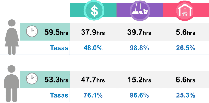 Las mujeres en México trabajan seis horas más en promedio a la semana que los hombres, revelan datos difundidos hoy por el Instituto Nacional de Estadística y Geografía (Inegi).A nivel nacional, el promedio de horas semanales de tiempo total de trabajo para las mujeres de 12 años y más es de 59.5 horas y para los hombres es de 53.3 horas, según la sexta edición de la Encuesta Nacional sobre Uso del Tiempo (ENUT) 2019, realizada por el Inegi en colaboración con el Instituto Nacional de las Mujeres (Inmujeres). Así, se identifica una brecha desfavorable para las mujeres de 6.2 horas más de trabajo total a la semana. El Inegi destacó que en ningún estado de México hay una brecha a favor de las mujeres, todas son negativas para ellas. En Jalisco, las mujeres laboran 5.6 horas más que los hombres.Las mayores brechas de género se registran en los estados de Zacatecas, Guerrero, Oaxaca, Sinaloa y Veracruz, con -12.2, -9.6, -9.1, -8.7 y -8.7 horas, respectivamente. Mientras que las menores brechas se ubican en: Campeche, Quintana Roo, Yucatán, Tabasco y Nuevo León, con -0.4, -1.0, -2.1, -3.5 y -3.7 horas, respectivamente.El 30.9% del tiempo total de trabajo de la población para las mujeres corresponde al realizado para el mercado, 66.6% al no remunerado de los hogares y 2.5% a la producción de bienes para uso exclusivo del hogar. Para los hombres, 68.9% se dedica al trabajo para el mercado, 27.9% para el no remunerado de los hogares y 3.1% a la producción de bienes para uso exclusivo del hogar.IM