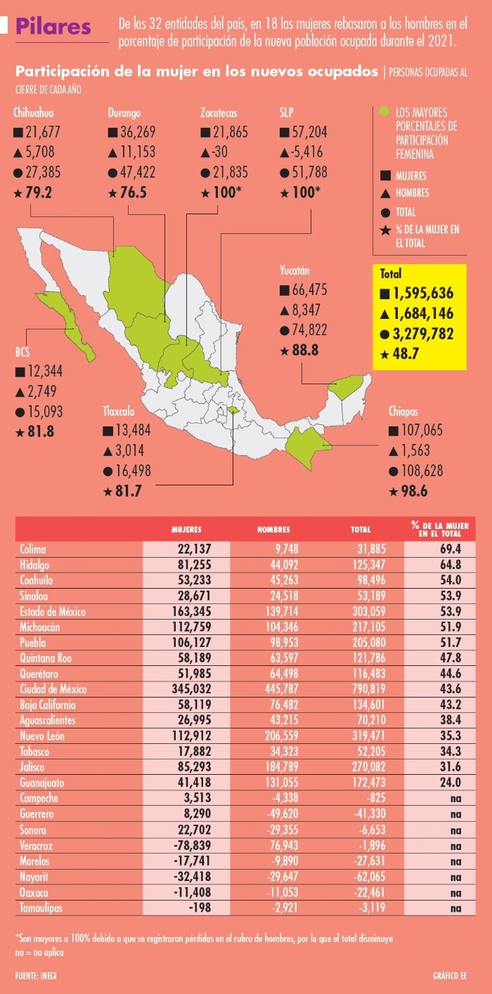 La mujer jugó un papel relevante en la recuperación del mercado laboral de la mayoría de las entidades federativas del país durante el 2021, tras las mermas que trajo consigo la pandemia de COVID-19.A nivel nacional, de los 3.28 millones de nuevos ocupados al cierre del año pasado, respecto al 2020, 48.7% lo aportó el género femenino, de acuerdo con datos del Instituto Nacional de Estadística y Geografía (Inegi).En 18 entidades, más de la mitad de los trabajos creados correspondieron a mujeres; San Luis Potosí y Zacatecas fueron los estados donde se convirtió en un pilar absoluto en la reactivación del trabajo.En el caso del territorio potosino, ingresaron 51 mil 788 personas a trabajar, resultado de la generación de 57 mil 204 puestos de mujeres y de la pérdida de 5 mil 416 empleos de hombres. Mientras en Zacatecas se crearon en total 21 mil 835 trabajos, producto del saldo positivo de 21 mil 865 mujeres y del despido de 30 hombres. Es decir, en ambos estados el género femenino fue el sostén del mercado laboral.Chiapas fue otra entidad donde la mujer fue un pilar, ya que su participación ascendió a 98.6% del total de nuevos ocupados. Por su parte, en Yucatán, Baja California Sur y Tlaxcala la aportación femenina se ubicó en un rango de 80-90 por ciento.Les siguieron Chihuahua (79.2% de las nuevas plazas se ocupó por mujeres), Durango (76.5%), Colima (69.4%), Hidalgo (64.8%), Coahuila (54.0%), Sinaloa (53.9%), Estado de México (53.9%), Michoacán (51.9%) y Puebla (51.7 por ciento).Hay tres situaciones especiales, debido a que la generación de ocupadas no compensó el registro de pérdidas en el total general: Campeche (creación anual de 3 mil 513 trabajos ocupados por mujeres, frente a una merma total de -825), Guerrero (8 mil 290 mujeres contra -41 mil 330 bajas) y Sonora (22 mil 702 mujeres y un saldo total de -6 mil 653).En todas estas entidades citadas, la mujer fue un motor económico al tener mayor relevancia respecto al papel que jugó el género masculino en la reactivación del empleo.Con menos de 50%Los estados con una participación femenina inferior a 50%, pero mayor a 40%, fueron Quintana Roo (47.8%), Querétaro (44.6%), Ciudad de México (43.6%) y Baja California (43.2 por ciento).En el rango 30-40% se ubicaron Aguascalientes (38.4%), Nuevo León (35.3%), Tabasco (34.3%) y Jalisco (31.6 por ciento). De los estados con saldo positivo por parte de la mujer, Guanajuato presentó el menor peso, con 24.0% del total creado. En cinco estados hubo bajas de mujeres de las plantillas.La mayor pérdida se observó en Veracruz, con -78 mil 839 despidos en el 2021. Los otros saldos negativos fueron en Morelos (-17 mil 741), Oaxaca (-11 mil 408) y Tamaulipas (-198).A pesar de que la mujer fue el pilar laboral del país, las condiciones a las que ingresó fueron precarias.De las 1.60 millones de nuevas ocupadas en el 2021, 87.7% entró a trabajar con un máximo de ingresos de hasta dos salarios mínimos.De dicho total, 68.8% no tuvo acceso a las instituciones de salud públicas y privadas.
