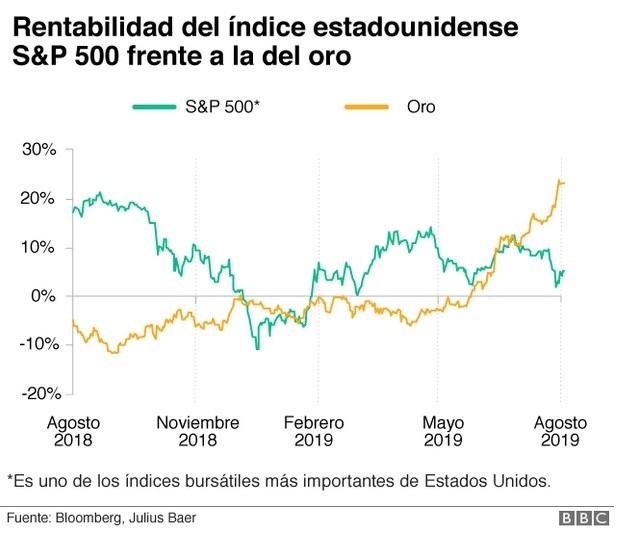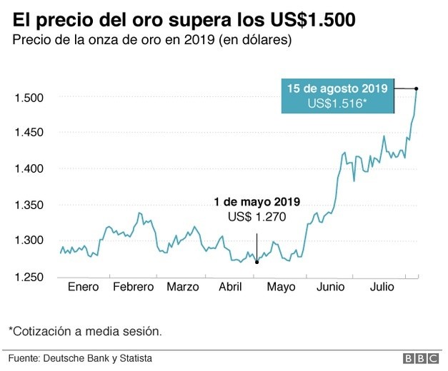 Guerra comercial, caída en los mercados y en definitiva miedo una recesión.Esta es la principal razón que ha llevado a inversores de todo el mundo a dejar de apostar por las compañías que cotizan en las bolsas y a poner su dinero en el oro.Lo hacen porque los datos económicos sugieren que las empresas no van a generar los beneficios esperados y por el temor a un cambio de ciclo.Por eso prefieren limitar sus riesgos y su exposición a las bolsas acudiendo a activos que consideran más seguros como el dólar, el franco suizo y el yen, o también la deuda emitida por países como Alemania o Estados Unidos, además del oro.Otros factores como las tensiones geopolíticas o el escaso valor del mercado de bonos no han hecho más que apuntalar esta incertidumbre.Con esto en mente, el precio de la onza de oro superó por primera vez en más de seis años los US$1.500, el nivel máximo marcado en marzo de 2013.Solo en los tres últimos meses y medio ha repuntado desde los US$1.270 a los US$1.516 en los que cotizó en la sesión de este jueves.Esto supone una subida de casi el 20%."El mercado se está preparando para un cambio de ciclo y eso ha hecho que el oro se dispare", afirma Javier Molina, portavoz de la plataforma eToro.Como sucede en todas las crisis, el metal precioso sigue siendo una de las pistas a la que mirar cuando las cosas se ponen feas.Y parece que lo están.En primer lugar a la desaceleración del crecimiento. A escala mundial la economía podría haber entrado ya en una fase de recesión.La primera señal ha llegado de la mano de un indicador clave: la curva de rentabilidad.Por primera vez desde 2007, un año antes de gran crisis financiera mundial, se ha dado la vuelta.Eso significa que a los gobiernos de Estados Unidos y Reino Unido les sale más barato emitir deuda a 10 años que a dos (pese a que el riesgo es mayor cuanto más tiempo le dejas dinero a alguien).Este fenómeno es inusual y suele anunciar una recesión o, al menos, una desaceleración significativa en el crecimiento económico a escala global."Sin duda, durante este trimestre, el colapso de la rentabilidad de los bonos ha sido el principal impulsor del repunte del oro", le dice a BBC Mundo Ole Hansen, jefe de estrategia en materias primas del danés Saxo Bank.A esto se suma que Alemania presentó esta semana sus datos de PIB del segundo trimestre.Su economía se contrajo un 0,1% arrastrada por la caída de las exportaciones y la producción industrial, sus dos grandes pilares, en medio de la guerra comercial entre China y EE.UU., y el caótico Brexit.Por su parte, China publicó sus datos de ventas minoristas y de producción industrial evidenciando, dicen los analistas, la debilidad de su demanda doméstica y un menor consumo.Para Mark Haefele, responsable de inversiones del banco suizo UBS, estos dos datos "dan continuidad a una tendencia de crecimiento global débil que ya dura varios meses".Las expectativas de que la economía mundial siga siendo tenue van a provocar que los tipos de interés sean bajos, que es la manera que tienen los bancos centrales de estimular el crecimiento.Pero esta vez, no está claro que los bancos centrales cuenten en su arsenal con políticas eficaces para llevar a cabo esta tarea y eso crea más incertidumbre."De cara al futuro, todas las miradas estarán puestas en la Fed. Cualquier recorte adicional de tipos en una coyuntura de incertidumbre geopolítica podría apuntalar aún más el precio del oro", explican los expertos de M&G Investments.En segundo lugar, los mercados tienen miedo a la escalada de la guerra comercial entre Estados Unidos y China.Muchos analistas creen que la guerra comercial no va a relajarse, va a aumentar de intensidad."La disputa comercial se intensificará en las próximas semanas, ya que ninguna de las partes tiene interés en dar marcha atrás, lo que debería alimentar la inquietud actual del mercado y respaldar los activos de refugio seguro como el oro", explica Norbert Rücker, jefe de Economía de Julius Baer.De hecho, lo que hasta ahora ha sido una guerra de aranceles, escaló a una guerra de divisas, cuando China decidió devaluar el yuan para hacer más competitivas sus exportaciones.Una guerra de divisas afecta a otros países a escala global, no solo a los dos que se enfrentan por los flujos comerciales."No creemos que las autoridades chinas vaya a dejar caer aún más su divisa, pero tampoco vemos una rápida resolución" de la guerra comercial, apunta el equipo de análisis global de Bank of America Merrill Lynch.La demanda del oro ha estado fuerte.Los bancos centrales compraron el metal precioso por una cifra récord de US$15.700 millones solo en el primer semestre de 2019.Es decir, en total, incorporaron a sus reservas 145,5 toneladas de oro en ese periodo, una subida del 68% en comparación con el primer trimestre de 2018.Estas cifras representan el inicio más fuerte de año desde 2013.Los principales compradores de oro son países como Rusia, Irán y China, que responden a las sanciones de Estados Unidos vendiendo dólares y comprando oro para sus reservasPero los sucesos en Reino Unido, paralizado políticamente con el Brexit, y Argentina, cuyo mercado se desplomó tras las primarias presidenciales tampoco han sentado bien a los mercado."Algunos mercados emergentes como Argentina están entrando en crisis. Históricamenteb cuando eventos similares han tenido lugar en la economía argentina, se ha producido un efecto contagio a otros países emergentes", dice Nitesh Shah, director de análisis en WisdomTree.Ahora puedes recibir notificaciones de BBC Mundo. Descarga la nueva versión de nuestra app y actívalas para no perderte nuestro mejor contenido.JM