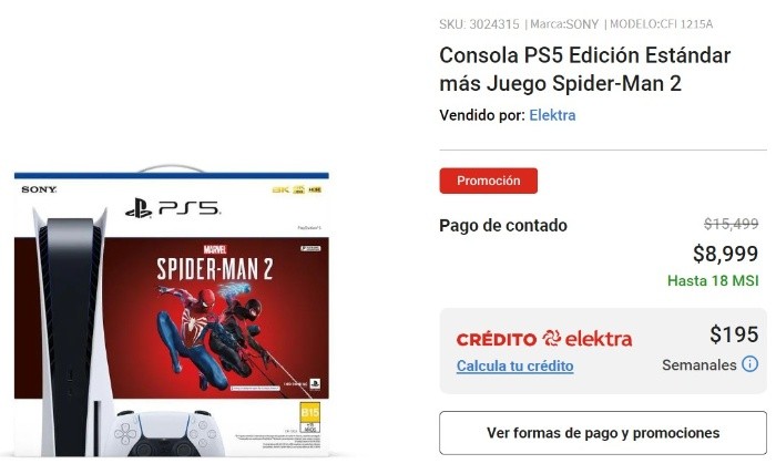 Los descuentos del Buen Fin 2023 continúan el día de hoy sábado 18 de noviembre de 2023. Dentro de esta temporada comercial, la empresa Elektra ha puesto uno de las consolas de videojuego a un precio bajísimo.La oferta del día, que estará vigente hasta el fin de la jornada del lunes 20 de noviembre o hasta agotar existencias, incluye un videojuego.El equipo ofertado es la Consola de Sony Play Station 5 en edición Estándar de 825 GB. El combo incluye el juego Spider-Man 2 (2023) del desarrollador Insomniac Games. Para obtener el mejor descuento será necesario que realices el pago mediante una cuenta de Paypal, por lo que deberás tener una cuenta disponible en este portal de pagos. El precio final es de $8,999.00 pesos, lo que implica una reducción de 42% con respecto al original.* * * Mantente al día con las noticias, únete a nuestro canal de Whatsapp * * *OB