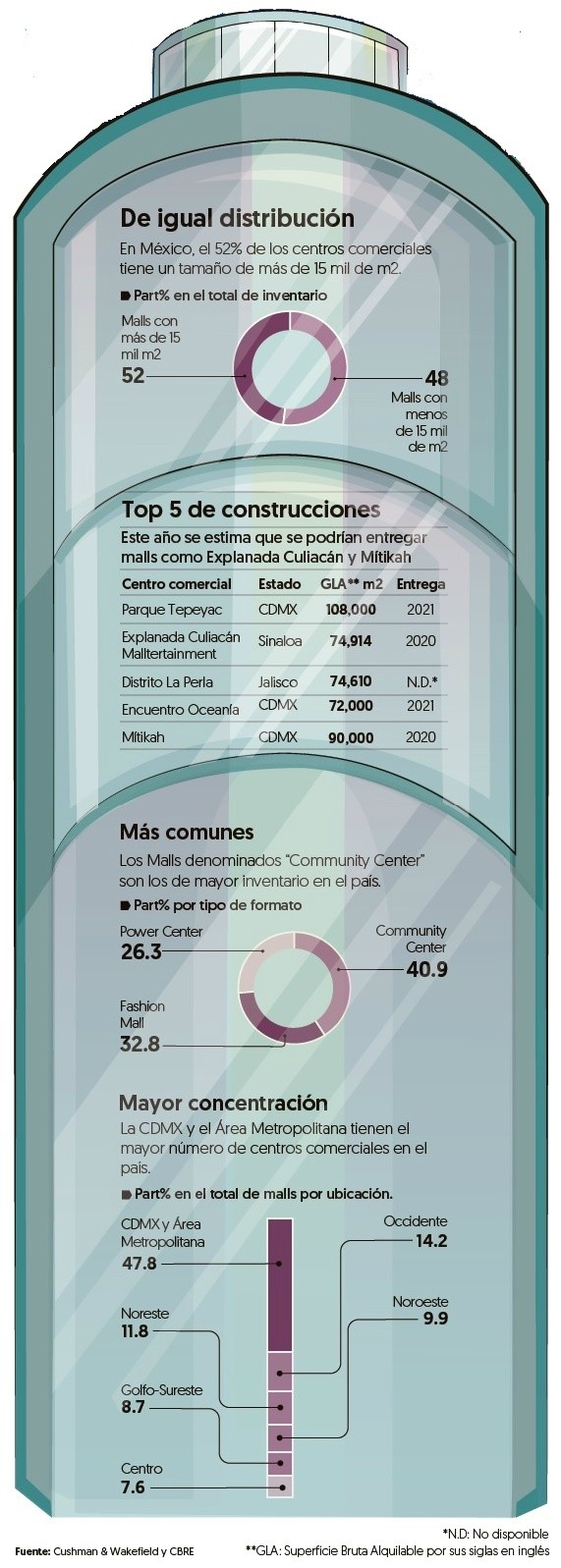 La construcción y entrega de 65 nuevos centros comerciales para los siguientes dos años en México enfrenta incertidumbre por el cambio de hábitos que trajo la pandemia del coronavirus, por lo que la fecha de entrega de estos proyectos podría retrasarse a igual que su diseño y modalidad, indicaron especialistas. “Con esta situación no se sabe bien cuándo se va a reactivar su construcción. Se estima que se entreguen en los últimos 24 meses alrededor de 2.4 millones de metros cuadrados (m2) distribuidos en 65 centros comerciales”, estimó Paola Huitrón, directora de Property Management & Transaction Services de CBRE. Adicionalmente, el cierre de miles de locales no esenciales por la contingencia sanitaria y el alza en la demanda del comercio electrónico ante la nueva realidad, provocaron un replanteamiento en el diseño de nuevos comercios en México. Entre los proyectos en puerta más importantes se encuentra Mítikah de Fibra Uno; The Park y The Landmark Tijuana de Thor Urbana; Explanada Culiacán de Grupo Gicsa; Distrito La Perla de Planigrupo; Parque Tepeyac de Fibra Danhos, y Encuentro Oceanía de IKEA. Con el efecto de la pandemia, los centros comerciales de lujo o enfocados al estilo de vida con conceptos como Liverpool o Palacio de Hierro, podrían ser de los más afectados por la incertidumbre económica y laboral, comentó Víctor Lachica, director general de Cushman & Wakefield. “Creo que muchos de los nuevos locales que vamos a ver serán más chicos y vamos a tener inclusive una reconversión de áreas de bodegas más grandes o áreas de entrega de producto para la última milla, para tiendas como BestBuy u Office Max”, indicó. Agregó que en el país hay oportunidad de incrementar el número de metros cuadrados comerciales por persona, ya que actualmente en México hay cerca de 3 a 3.5 m2 por habitante, mientras que en Estados Unidos hay 9.2 m2 de espacio de venta por habitante. “Quiere decir que podríamos crecer tres veces más”, detalló Lachica. En México, las Fibras más afectadas por la pandemia por su mezcla de centros comerciales son Fibra Shop, que prácticamente sólo se dedica al desarrollo de plazas, Danhos con un 68 por ciento, Fibra HD con un 57 por ciento de espacios comerciales y Fibra Uno con un porcentaje de 37 por ciento dedicado a centros comerciales. Algunas de las principales desarrolladoras de plazas comerciales en el país han retomado sus actividades para dar continuidad a proyectos. Gabriel Ramírez, CFO de Fibra Shop, detalló que actualmente continúan con el centro comercial de Distrito La Perla en Guadalajara, un centro comercial de 130 mil m2 en su primera etapa y se espera alcance los 180 mil m2 de piso de venta. “Tenemos 18 centros comerciales en operación, uno de ellos se encuentra en construcción. La idea es que se termine y abra durante el año”, dijo. FUNO anunció el regreso a la obra de Mítikah, el desarrollo de usos mixtos de la Ciudad de México, que contará con un centro comercial de más de 80 mil m2, actualmente ya muy avanzado en comercialización con marcas como Liverpool. Grupo Axo, Inditex y Alsea. En contraste, Planigrupo, desarrolladora de conceptos tipo neighbourhood malls con más de 38 centros comerciales en el país, se mantiene conservador sobre el cambio al negocio, ya que la mayoría de sus desarrollos se encuentran anclados a un supermercado o marcas de servicio. Elliott Bross Umann, CEO de Planigrupo, dijo que su modelo “resultó ser muy resiliente con este tipo de eventualidad (el Covid-19)”, aunque por el momento no harán nuevas inversiones. “Lo que aprendimos fue que el entretenimiento es más vulnerable que vender artículos de primera necesidad, necesitamos crear espacios más seguros, invertir en más tecnología”, dijo. Al respecto, Alejandro González, analista de Intercam Banco, opinó en un reporte que, en cuanto a los inmuebles comerciales, se espera que el regreso a la normalidad también sea pausado. “Probablemente tardará el regreso de los clientes a las plazas comerciales y para que el tráfico en las mismas llegue a niveles similares a los anteriores, también considerando la aceleración de tendencias como el e-commerce. No obstante, creemos que una vez que exista menor incertidumbre los niveles verán recuperaciones”, anticipó.