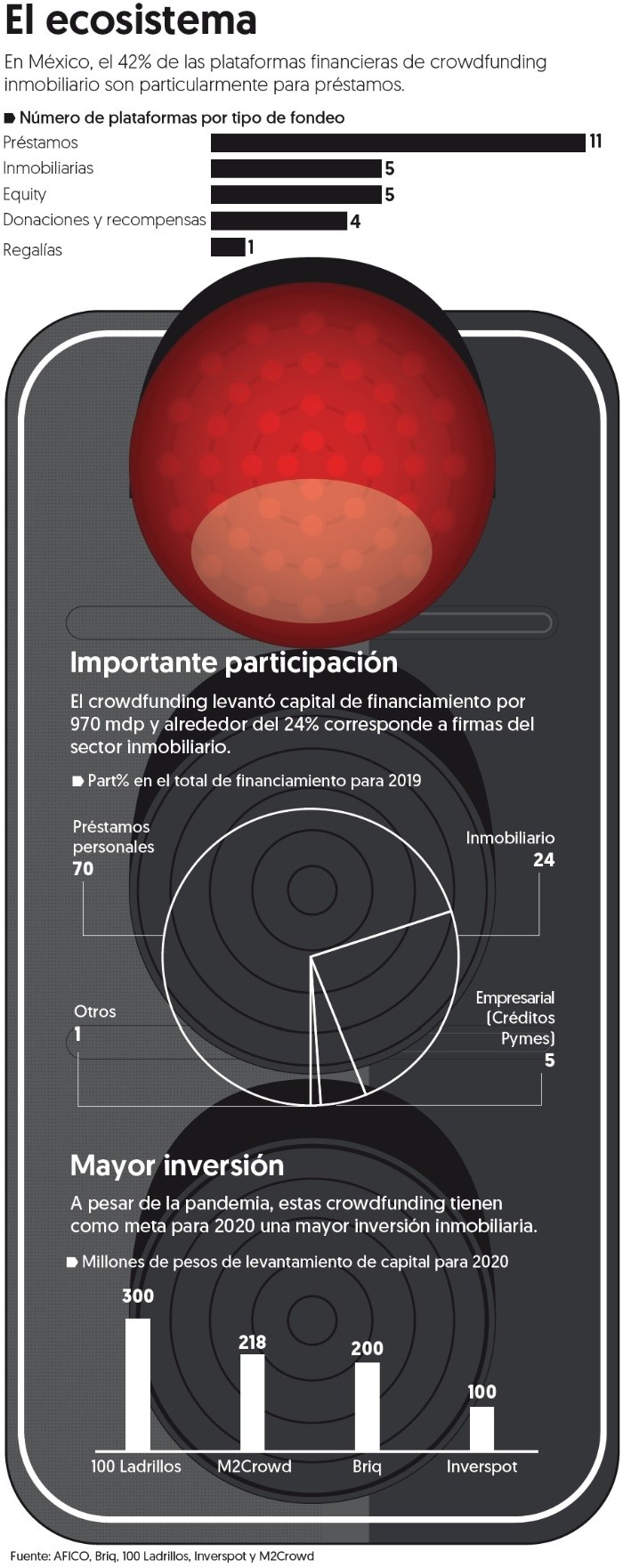 La pandemia del COVID-19 retrasó la entrega de licencias por parte de la Comisión Nacional Bancaria y de Valores (CNBV) a las plataformas financieras de crowdfunding inmobiliario como Inverspot, Briq. mx, M2Crowd, Expansive y 100 Ladrillos, que desde septiembre de 2019 solicitaron autorización para continuar operaciones al amparo de la Ley Fintech aprobada en 2019.De acuerdo con la CNBV, hay cerca de 80 plataformas Fintech en espera autorización, que operan como lo hacían antes de la aprobación de la Ley Fintech.Juan Carlos Castro, presidente de la Asociación de Plataformas de Fondeo Colectivo (Afico) explicó que antes de la pandemia se esperaba que a más tardar en junio de 2020 se emitieran las primeras licencias, lo que impulsaría el levantamiento de capital, al dar mayor certidumbre a este esquema de financiamiento.“La mayoría de plataformas tenían contemplado un esfuerzo de levantamiento de capital a raíz de que todos tuvieran su licencia.Pintaba un año donde sucediera todo eso, de la mano de la CNBV y la dinámica regulatoria se lograra consolidar dentro del sistema financiero el crowdfunding. Después vino la pandemia y retrasó por completo los tiempos regulatorios”, aseguró.Miembros del sector alertaron que el proceso de autorización podría venir hasta 2021 por la pandemia.Pese a la situación, las plataformas de crowdfunding inmobiliario, recibieron nuevas solicitudes de inversionistas, aunque por montos menores de entre mil y 20 mil pesos.La plataforma de financiamiento para desarrolladoras, M2Crowd, mantiene una expectativa a la baja en su fondeo de este año, pues apenas ha levantado 44 millones de pesos de capital para desarrollo habitacional en el primer semestre, cuando el año pasado en ese mismo periodo ya había alcanzado los 58 millones de pesos. Su meta es cerrar este año con 218 millones de pesos.“Se debe a un vacío extraordinario, entre marzo y abril, nos fuimos casi al suelo, si llevábamos un ritmo de unos 8, 10 o 12 millones de pesos mes a mes, de repente en marzo y abril nos fuimos a 2 millones de pesos, una sexta parte de lo que estábamos acostumbrados”, afirmó Simon Dalgleish, CEO de M2Crowd.Por su parte, Briqmx, plataforma de crédito a la construcción y copropiedad, planea cerrar el 2020 con una inversión total de más de 200 millones de pesos, informó Alberto Padilla, CEO de la firma.“El fondeo no bajó tanto, pero sí la oferta que le dábamos a los inversionistas (...) Desde el aviso de reabrir obras, hemos visto semanas récord, ha sido un crecimiento muy acelerado. Hicimos un ajuste de nuestra meta y creo que vamos a rebasar los 200 millones de pesos”, aseguró.David Agmon, fundador y CEO de Inverspot, afirmó que la pandemia atrajo a muchos inversionistas que se dieron cuenta de la importancia de ahorrar.“Nos han llegado muchos inversionistas nuevos, con eso hemos compensado mucho esta oportunidad de seguir fondeando proyectos inmobiliarios”, dijo.Para este año, Inverspot estima que alcanzará los 100 millones de pesos de levantamiento de capital.De acuerdo con los especialistas, el sector comercial y el de oficinas será quizá los segmentos que puedan necesitar de este tipo de instrumentos para poder recuperarse del impacto por la pandemia.Simon Dalgleish, CEO de M2Crowd, afirmó que los segmentos inmobiliarios que más le preocupan son el de oficinas y el comercial, que son ahora los más difíciles de vender.“Lo que más preocupa es la parte de oficinas (..) Industrial incluso con todo lo que está pasando en el T-MEC, sugiere que puede haber una aceleración por fábricas o manufactureras que pudieran estar reubicando algunas plantas. Comercial es donde me preocupa un poco más; hoy quien está sufriendo es quien quiere vender”, agregó.Iván Carmona, socio y cofundador de 100 Ladrillos, plataforma de copropiedad en proyectos de oficinas, locales comerciales y bodegas industriales, mencionó que si bien el modelo ya era innovador previo a la pandemia, la crisis ha puesto en el centro la tecnología para poder avanzar en los próximos años en la recuperación.