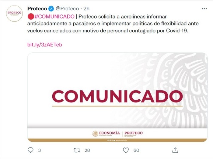 Luego de que se diera a conocer la cancelación de al menos 16 vuelos en el Aeropuerto Internacional de Guadalajara y cuatro en el de Puerto Vallarta, la Profeco emitió un comunicado para solicitar a las aerolíneas que, ante la cancelación de vuelos con motivo de personal contagiado por COVID-19, informe de manera anticipada a sus usuarios e implemente políticas de flexibilidad.Lo anterior, debido a que la Ley de Aviación Civil establece que el pasajero tiene derecho a un trato digno y a contar con un alto nivel de información que le permita conocer sus opciones y tomar alternativas en caso de requerirlas.Por ello, las líneas aéreas están obligadas a informar de manera rápida y expedita al pasajero, con al menos 24 horas de anticipación a la salida programada, en caso de que se produzcan cambios en su itinerario o cualquier otra circunstancia que pudiera afectar el servicio contratado.Deberán hacerlo a través de llamadas telefónicas, correos electrónicos, mensajes de texto o cualquier otro medio electrónico."Si bien la propagación de los contagios se da en un contexto de pandemia, esta Procuraduría pide a las líneas aéreas ofrecer a los consumidores alternativas para reprogramar sus vuelos o bien, obtener el reembolso del pasaje, de acuerdo con la ley y sus políticas de flexibilidad", señaló el comunicado emitido.Este jueves, el Grupo Aeroporturario del Pacífico informó sobre la cancelación de al menos 16 vuelos (ocho de salida y ocho de llegada) en el Aeropuerto Internacional de Guadalajara ante la falta de tripulación, en medio del incremento de contagios de COVID-19 y la llegada de ómicron al Estado.Las empresas en donde se reportó la falta de personal para continuar con las operaciones programadas son: Aeroméxico, Viva Aerobús y Alaska Airlines.En el Aeropuerto Internacional de Puerto Vallarta se presentaron también cuatro cancelaciones más: dos de la compañía Aeroméxico y el resto de Alaska Airlines y Westjet.Para mayor información o asesoría la persona usuaria puede contactar al Teléfono del Consumidor en el 55 5568 8722 para la Ciudad de México y área metropolitana, y en el número 800 468 8722, sin costo para el interior de la República Mexicana, en un horario de lunes a viernes de 9:00 a 19:00 horas, sábados, domingos y días festivos de 10:00 a 18:00 horas.También disponible en:O bien, acudir a cualquiera de los módulos de Profeco ubicados en las terminales aeroportuarias.JM