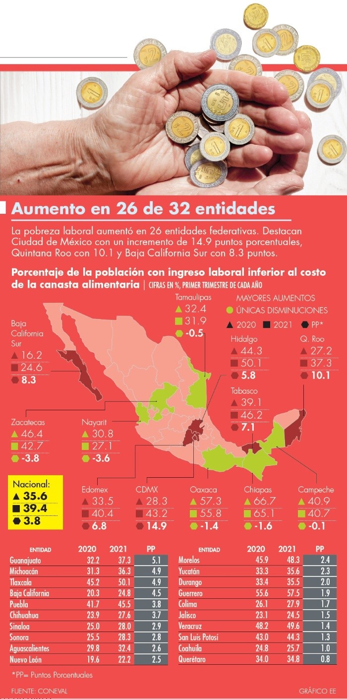 Si bien el impacto generalizado de la emergencia sanitaria y las medidas adoptadas para mitigar la contingencia por el COVID-19 contrajeron la economía nacional y, por ende, aumentaron los índices de pobreza laboral a nivel nacional, seis estados lograron disminuir este indicador en el primer trimestre del 2021.Estas entidades que consiguieron descender el porcentaje de la población con un ingreso laboral inferior al valor de la canasta alimentaria, en comparación con los resultados de los primeros tres meses del 2020, fueron: Campeche (pasó de 40.9 a 40.7%, -0.1 puntos porcentuales), Tamaulipas (de 32.4 a 31.9%, -0.5 puntos), Oaxaca (de 57.3 a 55.8%, -1.4), Chiapas (de 66.7 a 65.1%, -1.6), Nayarit (de 30.8 a 27.1%, -3.6) y Zacatecas (de 46.4 a 42.7%, -3.8 puntos porcentuales).De acuerdo con datos del Consejo Nacional de Evaluación de la Política de Desarrollo Social (Coneval), la pobreza laboral, definida como el porcentaje de la población que no puede adquirir la canasta alimentaria con su ingreso laboral, aumentó 3.8 puntos porcentuales en el país, al pasar de 35.6 a 39.4% entre el primer trimestre del 2020 e igual periodo del año en curso.“Entre los factores que explican el incremento anual de la pobreza laboral se encuentran la disminución anual de 4.8% en el ingreso laboral real y el aumento de las líneas de pobreza extrema por ingresos (valor monetario de la canasta alimentaria), de 3.7% en zonas urbanas y de 4.0% en zonas rurales”, detalló el Coneval.En ingreso laboral per cápita, nueve entidades mostraron incrementos (se encuentran las seis que disminuyeron su pobreza laboral): Nayarit (19.0% a tasa anual real), Zacatecas (7.1%), Oaxaca (4.2%), Chiapas (2.7%), Campeche (1.1%), Jalisco (0.9%), Morelos (0.7%), Veracruz (0.6%) y Tamaulipas (0.2 por ciento).Se observa que a pesar de que Jalisco, Morelos y Veracruz incrementaron este indicador, fue insuficiente para evitar el alza en su pobreza laboral.Desde otra perspectiva, la pobreza laboral aumentó en 26 de las 32 entidades.El mayor ascenso se produjo en la Ciudad de México, que ha sido el territorio más castigado por la pandemia (obtuvo la mayor pérdida de empleos formales entre marzo del 2020 y abril del 2021, con 230 mil 901 despidos acumulados.Además presentó la tercera caída más pronunciada de la actividad económica en el último trimestre del año pasado, con -9.0% anual desestacionalizada, y registró la mayor disminución en ingreso laboral per cápita en el primer trimestre del 2021, con -20.3% anual real).La pobreza laboral de la capital del país pasó de 28.3% en los primeros tres meses del 2020 a 43.2% en el mismo lapso de este año, es decir, un crecimiento de 14.9 puntos porcentuales.Le siguieron Quintana Roo (de 27.2 a 37.3%, +10.1 puntos), Baja California Sur (de 16.2 a 24.6%, +8.3) y Tabasco (de 39.1 a 46.2%, +7.1 puntos porcentuales).En tanto, los estados en lo que se presentó el mayor porcentaje de la población que no puede adquirir la canasta alimentaria con su ingreso laboral se ubican en todo el ancho del país.Algunos de estos estados fueron Chiapas (65.1% en esta condición), Guerrero (57.5%) y Oaxaca (55.8%), mientras las menores relaciones se dieron en Nuevo León (22.2%), Jalisco (24.5%) además de Baja California Sur (24.6 por ciento).ContextoPor la emergencia sanitaria derivada del virus SARS-CoV-2 en México, se estableció la suspensión de actividades no esenciales en marzo del 2020.Debido a que a finales de 2020 se observó un aumento en el número de casos por COVID-19, el número de entidades en semáforo rojo pasó de tres en la última semana de diciembre del 2020 a diez a finales de enero de 2021, lo cual afectó la reapertura que se venía dando.Ya en la última semana de febrero del 2021 ninguna entidad presentaba semáforo rojo por COVID--19.“El impacto generalizado de la emergencia sanitaria y las medidas adoptadas para mitigar la contingencia provocaron la contracción de la economía”, detalla el Coneval.