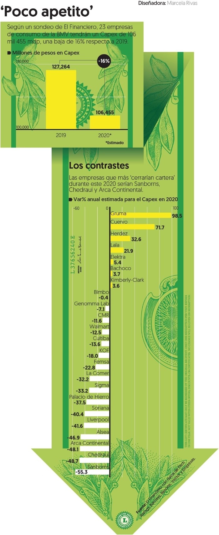 En México, 16 de las 23 emisoras de consumo que cotizan en la Bolsa Mexicana de Valores (BMV) como Sanborns, Chedraui, Arca Continental, Alsea, Liverpool y Soriana redujeron 30 por ciento en promedio su inversión en capital (Capex) para este año, afectados por la pandemia del coronavirus, que provocó caídas en sus ingresos y desaceleración en su ritmo de expansión.“Estas bajas en las inversiones del Capex responden a la necesidad que tienen las empresas de preservar su liquidez, no invierten no porque no quieran, quieren preservar liquidez en sus balances derivado de la situación de incertidumbre que hay, producto de la pandemia”, apuntó Marco Montañez, subdirector de análisis de Vector.Posponer lanzamientos de nuevos productos, frenar expansiones y aplicar eficiencias en logística son algunas de las acciones que implementaron algunas empresas.La emisora que cerrará el año con un mayor ajuste es Sanborns con un Capex de 400 millones de pesos, lo que significaría un recorte de 55.3 por ciento comparado con lo ejercido en 2019.“Desde hace algunos años la compañía no ha logrado que las ventas mismas tiendas repunten, y en donde probablemente ha tenido la mayor afectación es de las ventas en línea, hace sentido que no estén realizando inversiones para apertura de tiendas, hasta que la compañía no vea una mejora en el crecimiento orgánico”, explicó Verónica Uribe, analista especializada en consumo.En tiendas departamentales, El Puerto de Liverpool recortó su inversión para este año en 41.6 por ciento y Palacio de Hierro lo hizo en 37.5 por ciento.“La mayoría cuando anunció que estaba deteniendo sus planes o frenándolos detalló que era por liquidez, Liverpool en específico sí señaló que era para preservar la liquidez, mientras que, en otros casos como las aperturas de tiendas de autoservicio como Walmart y Chedraui, se debió más a cerraron dependencias que les tenían que dar permisos y por eso no estaban realizando las aperturas que tenían planeadas”, indicó Marisol Huerta, analista de Ve Por Más.En el caso de los autoservicios, todas las cadenas disminuyeron su Capex, pese a que son las que mejores desempeños en ventas comparables presentaron durante el año.Chedraui es la que más bajó su inversión en 48.7 por ciento comparado con el 2019; seguida de Soriana con una baja de 40.4 por ciento; La Comer con 32.2 por ciento, y finalmente Walmart que recortó su Capex en 12.5 por ciento.“El dinamismo para construir nuevas tiendas no es el mismo bajo la nueva normalidad; además, muchas cadenas prefirieron ser cautas en cuanto al gasto de su capital dada la incertidumbre económica que se generó a causa de la crisis sanitaria”, refirió Jerónimo Cobián, analista de Actinver.Otro caso fue Femsa que sufrió estragos en las tiendas Oxxo y las estaciones de servicio Oxxo Gas por la baja movilidad del ‘Quédate en Casa’, motivo por el que frenó su expansión e incluso cerró más de 100 sucursales.De igual forma se vieron afectados los restaurantes y cafeterías de Alsea y CMR, que cerraron sucursales, pues la operación por delivery no fue apta para todas las locaciones, con lo que anunciaron que reducirán en 46.9 y 11.6 por ciento anual, respectivamente, su Capex.Por su parte, empresas de alimentos y bebidas además de adaptarse al nuevo etiquetado de advertencia ajustaron su inversión para este año, como Arca Continental que cortará 48.1 por ciento de su inversión para este año; KOF que ajustará 18 por ciento a la baja su inversión; Cultiva con una baja de 13.6 por ciento y Bimbo con un ajuste de 11.8 por ciento.Del lado contrario, sólo siete de las 23 emisoras de consumo que cotizan en la Bolsa Mexicana de Valores (BMV) aumentaron su inversión para el cierre del año, entre ellas destacan Gruma, Cuervo, Herdez y Lala que aumentaron 33.9 por ciento en promedio su Capex para el cierre de este año. La líder en inversión es Gruma que elevaría su inversión en aproximadamente 98.5 por ciento comparado con el 2019, seguido de la dueña de Tequila Cuervo, Becle, con alza del 71.7 por ciento, y Herdez con 32.6 por ciento.“Estas empresas están bajo circunstancias muy particulares, muchas de sus inversiones van hacia sus operaciones en el extranjero, como Gruma, que invierte más para aumentar capacidad de plantas sobre todo en Estados Unidos ante la creciente demanda”, afirmó Marcela Muñoz, subdirectora de análisis de Vector.