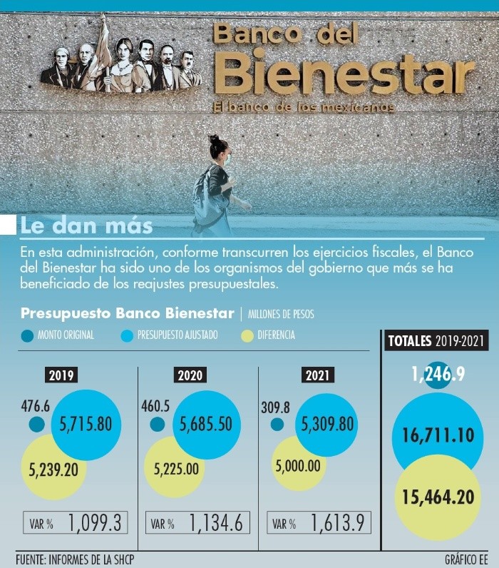 Durante el primer semestre del 2021, el Banco del Bienestar recibió una aportación de capital de 5 mil millones de pesos por parte de la Secretaría de Hacienda, con lo que su presupuesto para este año se ajustó al alza mil 613%, para contar con una partida presupuestal del orden de 5 mil 309 millones de pesos.En los últimos tres Presupuestos de Egresos a este banco se le han asignado de manera inicial partidas presupuestales que se amplían durante el transcurso de cada año y las cuales representan un incremento de más de mil por ciento respecto a la cantidad original asignada, convirtiéndose así en uno de los organismos que más se beneficia de los reajustes en el presupuesto de este gobierno.Por ejemplo, para este año la Secretaría de Hacienda preveía para el banco de desarrollo un presupuesto cercano a 309 millones de pesos; sin embargo, con la inyección de capital dicha cantidad aumentó a 5 mil 309 millones de pesos, es decir una diferencia de mil 613%; en el 2020, el monto inicial fue de 460 millones de pesos, pero esa cifra se elevó mil 134% para terminar en 5 mil 686 millones de pesos y en el 2019, su presupuesto se incrementó mil 099% para pasar de 476 millones de pesos a 5 mil 239 millones de pesos.Según los registros de Hacienda, el gobierno ha asignado al banco durante esta administración 16 mil 711 millones de pesos, de los cuales 15 mil 464 millones de pesos han sido para el plan de expansión de sus 2 mil 700 sucursales y el resto, mil 246 millones de pesos, para la ejecución del programa de Inclusión Financiera dentro del sector de ahorro y crédito popular.Especialistas de asociaciones de la sociedad civil coincidieron en que, en primera instancia, los recursos que recibe el banco deben de contar con mecanismos de evaluación y transparencia que justifiquen el gasto que ha realizado el gobierno con este organismo, el cual se pretende sea el principal dispersor de programas sociales de la administración.“La inversión pública requiere de mecanismos de gobernanza, que al día de hoy no existen, para evitar que se tomen decisiones que no cuentan con el aval de las evaluaciones o análisis de impacto y que más bien obedecen a intereses políticos... este caso hace evidente la debilidad institucional que existe para que el gasto público se oriente a lo que debería”, detalló Mariana Campos, coordinadora del Programa de Gasto Público y Rendición de Cuentas de México Evalúa.Para Adriana García, investigadora de la organización México, ¿Cómo vamos?, es urgente que el gobierno presente un plan de fiscalización de dicho proyecto, con el fin de justificar las inyecciones de dinero a este organismo, especialmente la de este 2021, donde se deben de priorizar temas de salud y para la reactivación económica del país en el contexto de la emergencia sanitaria.“La reasignación presupuestal es un ejercicio importante para dirigir los recursos públicos a atender los retos que estamos enfrentando los mexicanos… Habría que presentar un plan y una fiscalización del Banco del Bienestar y ver si hacen sentido los reajustes en un año de reactivación; haría mucho sentido que ese dinero estuviera destinado a temas como las vacunas y al proceso de logística para acelerar la campaña de vacunación”, explicó García.El Banco del Bienestar fue cuestionado sobre el avance en la edificación de sus nuevas sucursales, pero indicó que dicha información ya es competencia de la Secretaría de la Defensa Nacional, encargada del proyecto de expansión.Ambas especialistas coincidieron en que un plan de expansión de sucursales, así como el gasto destinado a ello, no hace sentido, cuando los servicios financieros transitan hacia la digitalización y, además, existen redes logísticas, tanto gubernamentales como privadas, que pudieran apoyar la entrega de los recursos de programas sociales.En julio del 2019, este banco registró un récord en su índice de morosidad (Imor) al alcanzar un porcentaje de 26.9 por ciento. Posteriormente, la administración pudo disminuir este indicador hasta septiembre del 2020, donde nuevamente la morosidad repuntó.A junio de este año, el Imor del organismo fue de 19.33% debido a los porcentajes de morosidad, de dos dígitos, que tienen tanto su cartera empresarial como la de consumo, segmento donde se encuentran los préstamos.Si te interesó esta noticia y quieres saber más, entonces descarga y descubre INFORMAPlus, la aplicación digital de EL INFORMADOR, en donde tenemos contenidos exclusivos, seleccionados por nuestros editores, para darles una experiencia más completa a los lectores.Descarga la aplicación y pruébala GRATIS por treinta días.Para iOS: https://apple.co/35jaVgb Para Android: https://bit.ly/3gwVSEVSi eres suscriptor de EL INFORMADOR tu acceso está incluido, solicítalo al 33 3678-7777.