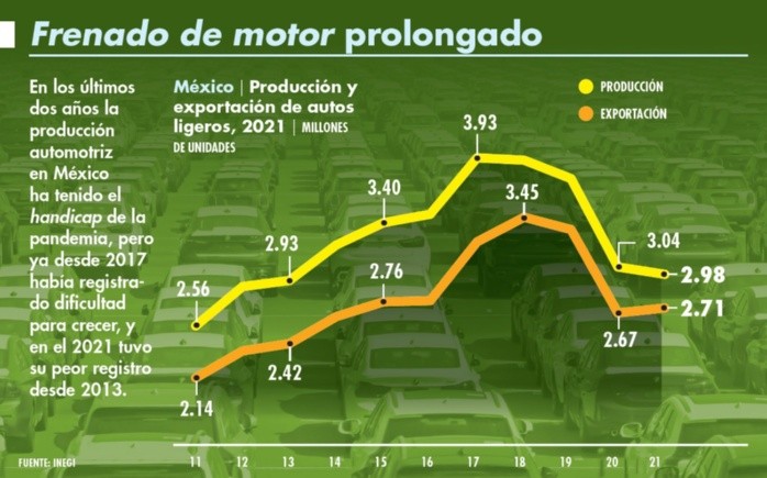 La problemática mundial de escasez de semiconductores, así como las diversas variantes de la pandemia por COVID-19 y el incremento en el costo de transporte marítimo, impidieron que México rebasara la barrera de los 3 millones de vehículos ligeros producidos en el 2021, con lo cual sumó cuatro años consecutivos de caídas en la fabricación de autos.Las empresas automotrices fabricaron 2 millones 979,276 de autos ligeros al cierre del 2021, que representa descenso de 2% respecto a enero-diciembre del 2020, cuando la industria se enfrentaba a la peor caída de su historia.De acuerdo con el Registro Administrativo de la Industria Automotriz de Vehículos Ligeros (RAIAVL) publicado por el Inegi, el dinamismo exportador de la industria automotriz tuvo una ligera alza de 0.9% de enero a diciembre al 2021, al enviar 2 millones 706mil 980 unidades exportadas, por la demanda del mercado estadounidense y canadiense, principalmente.El principal mercado de exportación de autos mexicanos, Estados Unidos, cayó 3% durante el 2021, en donde las empresas automotrices enviaron 2 millones 71 mil 668 unidades, pese a que existen muchos clientes que quieren comprar automóviles nuevos a altos precios. No obstante, el problema de los semiconductores de computadora persiste para que la industria pueda poner en marcha sus fábricas.Esto provocó que, en diciembre pasado, las exportaciones de autos mexicanos descendieran 17.3% respecto a igual mes del 2020, con 227mil 465 unidades contra los 275,081 autos.A principios del 2021, las empresas de la industria automotriz presentaron afectaciones por la falta de energía en el norte del país y las heladas en Estados Unidos, mientras que a mediados del mismo año comenzó el impacto de los semiconductores, factores que orillaron a tener un diciembre con la menor cifra de producción 212mil 272 vehículos ligeros, de la última década, al caer 16.5% respecto a igual mes del 2020.Ambas disminuciones representan “el mayor retroceso anual para un mes de diciembre desde que se tiene registro (2006)”, según un reporte del Grupo Financiero BASE.En diciembre, se presentaron afectaciones en la producción en las plantas automotrices de: Audi en San José Chiapa, Puebla y Mazda en Salamanca, Guanajuato. IHS Markit estimó que los niveles de producción de vehículos deprimidos afecten los plazos de entrega durante algún tiempo, presionando los inventarios agotados y retrasando el cumplimiento de pedidos vigentes.“El camino de la pandemia sigue siendo un importante impulsor del ciclo de demanda de automóviles de 2022, especialmente la carrera entre la vacuna y las variantes. Sigue habiendo preocupaciones y la aparición de la variante ómicron representa un desarrollo preocupante”, dijo Colin Couchman, director ejecutivo de previsión global de vehículos ligeros de IHS Markit.Las exportaciones automotrices mexicanas a Estados Unidos no lograron alcanzar su nivel anterior a la pandemia de COVID-19 en 2021, de acuerdo con datos del Departamento de Comercio. De enero a noviembre de 2021, estas ventas fueron por 117 mil 431 millones de dólares, una caída de 7.1% frente al mismo periodo de 2019, por lo que, al margen del resultado de diciembre, no lograrán recuperarse por completo de su caída de 2020.Según un reporte del Departamento del Tesoro, los cuellos de botella de la cadena de suministro continúan presionando los precios al alza de algunos bienes; en particular, las tasas de inflación de los autos nuevos y usados repuntaron en octubre debido a que la escasez de semiconductores siguió restringiendo la capacidad de las empresas para reemplazar inventarios ajustados y satisfacer la demanda en Estados Unidos.La falta de chips semiconductores es la principal traba que dificulta el crecimiento de las exportaciones automotrices mexicanas.En forma desglosada, en los primeros 11 meses de 2021 y frente al mismo lapso de 2019, las exportaciones de México de autos tuvieron un descenso de 24.3% (totalizaron 25 mil 659 millones de dólares), las de vehículos pesados disminuyeron 1.5% (34 mil 655 millones) y las de autopartes se contrajeron 0.4% (57 mil 117 millones).Las ventas tienen una contribución sobresaliente: abarcan 26.3% del total de exportaciones de productos de México al mundo.