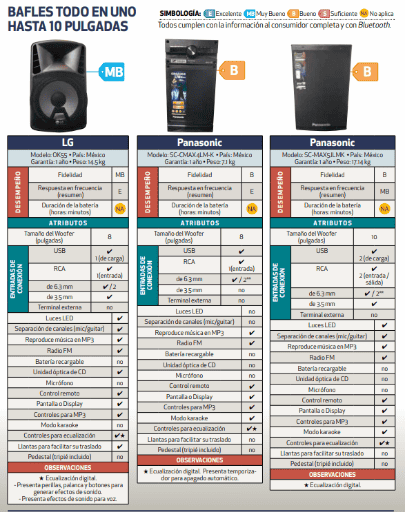 Si te encuentras en la búsqueda de un nuevo o mejor equipo de audio de buena calidad, te compartimos las mejores marcas según un estudio de Profeco.Dentro del Laboratorio Nacional de Protección al Consumidor, se analizaron tres tamaños de bafles todo en uno: 8, 10, 12 y 15 pulgadas de diámetro, de 17 modelos y 8 marcas distintas, todas con presencia en el mercado nacional. Todos los modelos tienen conectividad inalámbrica vía bluetooth.Respuesta en frecuencia (Rango audible): Se midió el rango de frecuencias audibles que es capaz de reproducir con un nivel aceptable, es decir, determinaron si las frecuencias bajas, medias y altas se reproducen aceptablemente, o si por el contrario, algunas de ellas no lo hacen con el suficiente nivel para que sean percibidas por el oído.Calidad de audio: Se utilizó un equipo analizador de espectro de audio con el que se midieron dos parámetros que determinan la calidad del sonido reproducido: fidelidad y rango audible.Información al consumidor: Todos los modelos analizados la incluyen completa; etiquetado, instructivo y garantía, solicitada en la normatividad aplicable.Fidelidad: Se midió la distorsión máxima con que reproducen las frecuencias audibles a un nivel de volumen moderadamente alto. Los mejores modelos reproducen un sonido poco distorsionado o más fiel al original, mientras que los de bajo desempeño se perciben ruidosos, incluso, con bajo volumen.De acuerdo con los resultados de la Profeco, estas son las bocinas de mejor calidad:Para llevar a cabo las pruebas de calidad, la Profeco tuvo que apegarse a las Normas Oficiales Mexicanas y otras que están involucrados en el comercio de estos equipos electrónicos, estos se mencionan a continuación:AH