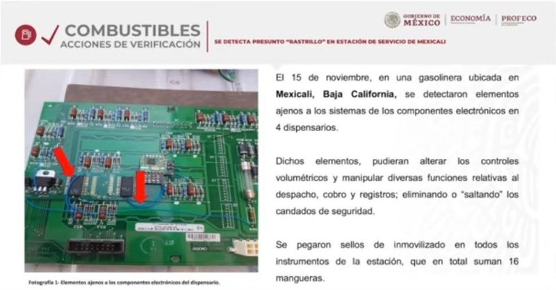 El titular de la Procuraduría Federal del Consumidor (Profeco), Ricardo Sheffield Padilla, advirtió que han encontrado nuevos dispositivos ajenos a los sistemas de las bombas dispensadoras de combustibles, mejor conocidos como "rastrillos", con los que las estaciones de servicio despachan gasolina de menos.Sheffield Padilla destacó que estos nuevos "rastrillos" tienen unos cables azules con los que brincan los candados de seguridad de tarjeta lectora de litros, los mismos, alteran los controles volumétricos y manipulan el despacho, cobro y registro.Los primeros dispositivos de este tipo se encontraron apenas el 15 de noviembre en una gasolinera de Mexicali, Baja California, en cuatro bombas de dispendio. El procurador indicó que el operativo para detectar estos dispositivos inició ayer domingo y seguirá.Adelantó que este caso derivará en una sanción penal. También informó que la Profeco realizó 760 visitas a estaciones con baños públicos, donde los mejor atendidos, en limpieza y seguridad, estuvieron en Baja California Sur, en una estación de servicio de Emerald Gas S.A. de C.V. sin cobrar por ese servicio.Los baños en peores condiciones estuvieron en Zacatecas, a cargo de la Distribuidora de Combustibles Zacatecas. "No cobran, pero pues está incobrable el baño, ojalá se esmeren en ese servicio", sostuvo Sheffield.IM