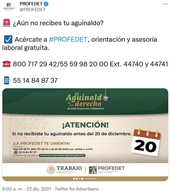 Los trabajadores en México con una relación de trabajo subordinado a un patrón tienen derecho a recibir un aguinaldo anualmente. Según la Ley Federal del Trabajo, el aguinaldo debe pagarse antes del 20 de diciembre.Es equivalente a por lo menos 15 días de salario por el año laborado. Si aún no has cumplido un año de trabajo o no laboraste un año completo para un empleador, tienes derecho a que se te pague la parte proporcional del aguinaldo.La Procuraduría Federal de la Defensa del Trabajo (Profedet) recuerda que la ley establece que es una obligación del empleador pagar el aguinaldo en tiempo y forma.En caso de que no se cumpla con el pago antes del 20 de diciembre, se contemplan sanciones de 50 a 500 veces UMA para este tipo de infracciones. La UMA es la referencia económica en pesos para determinar el pago de las obligaciones y supuestos previstos en las leyes federales de los estados. El valor diario de la UMA en 2021 es de 89.62 pesos.El trabajador tiene un año, a partir del 20 de diciembre de 2021, para reclamar el pago del aguinaldo o su pago completo ante las instancias competentes: La Profedet ofrece, de forma gratuita, los servicios de orientación y asesoría sobre el aguinaldo a través de sus 47 representaciones. Checa su ubicación en: cutt.ly/CRFoStmIM