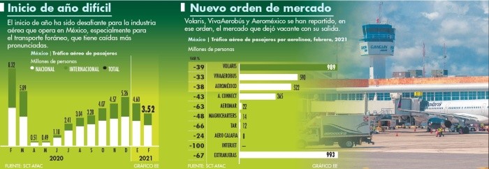 Las aglomeraciones que se viven estos días en los aeropuertos del país por motivo de la Semana Santa no muestran “el éxito” de la recuperación en el sector aéreo en México, que se mantiene bajo estrés financiero y sin ayudas gubernamentales. Durante el primer bimestre del 2021, de acuerdo con cifras de la Secretaría de Comunicaciones y Transportes (SCT) las aerolíneas nacionales e internacionales que operan en México transportaron a 8 millones 118,897 pasajeros en vuelos regulares, lo que representó una caída del 53.3%, respecto a igual periodo del 2020.De acuerdo con las previsiones de la industria turística internacional, el mercado doméstico ha mostrado un mejor comportamiento. En enero y febrero las ocho empresas que tienen operaciones (Interjet sumó el segundo mes completo sin actividad) transportaron el 60.6% de todos los pasajeros, al sumar 4 millones 925,052 clientes, lo que representó una baja del 42.2 por ciento.Las rutas locales con mayor demanda fueron: México-Cancún, Tijuana-México, Tijuana- Guadalajara y Monterrey-México.“La recuperación de la aviación está lejana. El mercado doméstico no ha dejado de tener cifras optimistas y positivas. En este momento, por el periodo vacacional pareciera que todo va bien, aunque estamos viendo un problema con el tema de tarifas. Hay exceso de oferta y los precios están bajos, lo que ocasiona una baja rentabilidad para las aerolíneas. En la industria se sabe que el peor veneno es el exceso de oferta porque eso lesiona las finanzas de las empresas”, comentó el analista de aviación, Carlos Torres.Del total de pasajeros atendidos (domésticos y foráneos), Volaris se mantiene en el liderazgo con su modelo de ultra bajo costo al sumar 2 millones 339,836 clientes en el primer bimestre del año, el 31.8% menos que igual periodo del año 2020.En segundo sitio continúa VivaAerobus con 1 millón 349,917 pasajeros y una baja del 27.5% (la menor de todas las aerolíneas que operan en el país) y en tercer lugar Aeroméxico, con 1 millón 163,756 viajeros, que le representaron una caída del 35.6 por ciento.El complicado mercado internacionalDurante enero y febrero pasados, las empresas nacionales que operan fuera de México sumaron 854,144 pasajeros, lo que representó una caída del 68.3%, debido a que apostaron a atender el mercado local.Por su parte, las aerolíneas internacionales transportaron a 2 millones 339,701 personas, el 62.1% menos que igual bimestre del 2020. Las rutas que mayor actividad registraron son: Dallas-Cancún, Chicago-Cancún, Houston-Cancún y Los Ángeles-Guadalajara.La baja actividad de Estados Unidos y Canadá, por restricciones impuestas por sus gobiernos han ocasionado que la actividad con México se encuentre en un momento complicado, del cual no se ve en el corto plazo una salida, aún con los procesos de vacunación en marcha.“Las tres principales aerolíneas nacionales tienen vuelos internacionales y ahora viven una situación compleja: baja rentabilidad en el mercado local y baja actividad en el internacional. Hay factores de ocupación altos, pero los aviones llenos no implican que las empresas están ganando. Las ventas anticipadas con promociones agresivas, de la mano de bancos, generan una liquidez por adelantado, pero en el mediano plazo si no hay más ingresos ese flujo se terminará”, agregó Torres.
