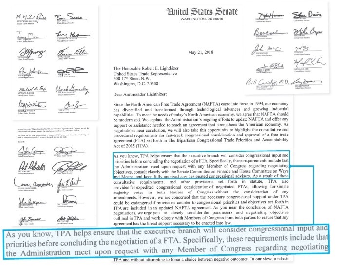 Más de 30 senadores republicanos se dirigieron al Representante Comercial de Estados Unidos y máximo representante de ese país en las mesas de negociación del Tratado de Libre Comercio de América del Norte (TLCAN), Robert Lighthizer, para expresarle su preocupación sobre la estrategia que el presidente Donald Trump buscaría usar para presionar al Congreso para ratificar el acuerdo comercial en el corto plazo. “Nos preocupan los recientes informes de los medios que sugieren que usted podría estar considerando una estrategia de ultimátum para presionar al Congreso a aceptar un TLCAN actualizado, incluso por medio de amenazas de retirarse del acuerdo original”, señalaron 32 legisladores republicanos en una misiva. De acuerdo con los senadores, una estrategia de “tómalo o déjalo” para el acuerdo que representa más de un billón de dólares de comercio trilateral podría tener efectos negativos, como poner en riesgo empleos de su propio país, así como también comprometer el crecimiento económico. Los funcionarios resaltaron su preocupación sobre obtener las garantías por las que aboga la Ley de Prioridades Comerciales y Rendición de Cuentas (TPA, por sus siglas en inglés), las cuales ayudan a que el Ejecutivo considere los aportes y prioridades del Congreso, previo al término de las negociaciones de los acuerdos comerciales en función de que éste pueda ser ratificado con mayor facilidad. “Como resultado de estos requisitos consultivos y otras disposiciones establecidas en el estatuto, la TPA también prevé la consideración rápida por parte del Congreso de los TLC’s negociados, lo que permite votaciones de mayoría simples en ambas cámaras del Congreso sin considerar ninguna enmienda. Sin embargo, nos preocupa que el apoyo legislativo necesario esté en peligro si las disposiciones son contrarias a las prioridades y los objetivos del Congreso”, mencionaron los legisladores. Esta semana, el secretario del Tesoro de Estados Unidos, Steven Mnuchin, dijo en una entrevista televisiva que una de las opciones que estarían considerando para que el acuerdo pudiera ratificarse en el año en curso sería procesar un tratado ‘adelgazado’, lo que quiere decir que sería un acuerdo sin cambios estructurales de fondo, que podría ser firmado sin la necesidad de ratificarse por el Congreso. Un tratado ‘skinny’ significaría concluir un texto en el que no se contemplen estatutos que impliquen un impacto en la legislación federal del país vecino, ya que esto requeriría por fuerza la ratificación del Congreso. “Hay ciertas cosas que a lo mejor no requerirían pasar al Congreso, por ejemplo, la regla de origen, porque anteriormente ya se modificaron las reglas de origen sin necesidad que pasara por el Congreso, hace como 10 años; los mecanismos de solución de diferencias tienen sus reglamentos, esos reglamentos tampoco pasaron por el Senado de México y tampoco pasaron por el Congreso de EU”, destacó Gustavo Uruchurtu, uno de los negociadores del TLCAN original. Algunos de los temas que sí implicarían un cambio en la legislación federal serían la cláusula ‘sunset’, que plantea poner una muerte súbita al acuerdo; y la estacionalidad agrícola. A pesar del contexto de incertidumbre, altos funcionarios de los países involucrados en el acuerdo están en contacto y con la disposición de reunirse en cualquier momento, aseguró la ministra de Asuntos Exteriores de Canadá, Chrystia Freeland. “Fue una de las cosas de las que hablamos ayer (con los ministros); todos podemos subirnos a un avión en cualquier momento si sirve para impulsar las negociaciones. Yo diría que tenemos un contacto muy estrecho y cercano”, dijo Freeland este martes. Pero la situación que vive el tratado no se ve con ojos positivos en todos los sectores; el empresario estadounidense Lance Fritz, CEO de la ferroviaria Union Pacific, empresa con operaciones en los tres países norteamericanos, aseguró estar preocupado por la situación. “Lo que me preocupa ahora es que parece que estamos en una carrera para llegar a un acuerdo, y si no lo podemos tener listo pronto vamos a tener que pausarlo por un tiempo. Y ese me parece que es un lugar poco sano para estar”, dijo Fritz en entrevista con la CNBC.