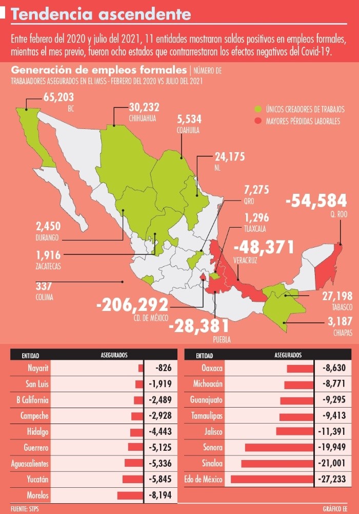 Si bien en todo el territorio nacional aún falta por recuperar más de 320 mil empleos formales, siguen en ascenso las entidades federativas que ya están recobrando los niveles prepandemia.De acuerdo con datos de la Secretaría del Trabajo y Previsión Social, al cierre de julio de este año se registraron en el país 20.29 millones de trabajadores asegurados en el Instituto Mexicano del Seguro Social (IMSS), frente a 20.61 millones en febrero del 2020, antes de que iniciaran los casos de COVID- 19, es decir, un saldo negativo de 321 mil 613 empleos.En este lapso de análisis, son 11 estados que muestran generación de trabajos formales: Colima, Tlaxcala, Zacatecas, Durango, Chiapas, Coahuila, Querétaro, Nuevo León, Tabasco, Chihuahua y Baja California.El mayor creador de empleos es Baja California, con 65 mil 203 plazas laborales; le siguieron Chihuahua, con 30 mil 232, y Tabasco, con 27 mil 198. Estas tres entidades recuperaron las cifras prepandemia desde octubre del año pasado.Los otros resultados positivos fueron en Nuevo León (24 mil 175 altas en el IMSS), Querétaro (7 mil 275), Coahuila (5 mil 534), Chiapas (3 mil 187), Durango (2mil 450), Zacatecas (mil 916), Tlaxcala (mil 296) y Colima (337).La primera entidad en superar los estragos que trajo consigo el COVID-19 en el mercado laboral fue Baja California, en agosto del 2020, con 3,790 nuevos puestos, respecto a febrero del mismo año, y considerando que al inicio de junio terminó la jornada nacional de sana distancia para evitar la propagación del virus (abril y mayo fueron de total confinamiento y paro de actividades no esenciales).En septiembre del 2020 también sólo Baja California exhibía un saldo positivo y seguía aumentando la generación de empleos formales (10 mil 768). A partir de octubre se unieron Tabasco (2 mil 456 nuevas contrataciones) y Chihuahua (6 mil 575), aunque ya los registros del estado que tiene a todos sus municipios en el programa federal de zona libre eran superiores (23 mil 1994).Estas tres entidades se mantuvieron como únicos creadores de trabajos asegurados en el IMSS hasta marzo de este año, cuando entraron en este grupo selecto Chiapas y Zacatecas; en abril estos cinco estados siguieron como las excepciones en el plano nacional.Durante mayo pasado se reconfiguró el mapa, pero continúo el incremento de estados que contrarrestaron el impacto de la pandemia (se elevó a seis): Baja California, Chihuahua, Tabasco, Zacatecas prolongaron la creación de plazas laborales, salió Chiapas y entraron Tlaxcala y Querétaro.En junio el número de gobiernos subnacionales creció a ocho, añadiéndose a este conjunto estatal Nuevo León y Colima.En julio del presente año subió a 11 entidades, cuyos nuevos integrantes fueron Coahuila, Durango y Chiapas (regresó).Sin embargo, todavía es insuficiente para que la recuperación de empleos formales se dé en todo el país.De las 21 entidades con pérdidas de puestos de trabajo asegurados en el IMSS, entre febrero del 2020 y julio del 2021, las mayores mermas se observaron en Ciudad de México (206 mil 292 bajas), Quintana Roo (54 mil 584), Veracruz (48 mil 371), Puebla (28 mil 381), Estado de México (27 mil 233), Sinaloa (21 mil 001) y Sonora (19,949).Mientras Nayarit es el estado más cercano de colocarse en niveles prepandemia, ya que muestra una merma de 826 trabajos.Corto plazoEn el corto plazo, en julio se generaron 116 mil 543 trabajos asegurados en el IMSS en México, en comparación con junio de este año, destacando en los primeros lugares Nuevo León (16 mil 180 nuevas contrataciones), Baja California (14 mil 880), Quintana Roo (10 mil 821) y Ciudad de México (10 mil 271).En total, solamente seis entidades presentaron saldos negativos: Colima (28 despidos), Nayarit (240), Michoacán (mil 382), Yucatán (mil 921), Sonora (2 mil 883) y Estado de México (11 mil 171).Si te interesó esta noticia y quieres saber más, entonces descarga y descubre INFORMAPlus, la aplicación digital de EL INFORMADOR, en donde tenemos contenidos exclusivos, seleccionados por nuestros editores, para darles una experiencia más completa a los lectores.Descarga la aplicación y pruébala GRATIS por treinta días.Para iOS: https://apple.co/35jaVgb Para Android: https://bit.ly/3gwVSEVSi eres suscriptor de EL INFORMADOR tu acceso está incluido, solicítalo al 33 3678-7777.