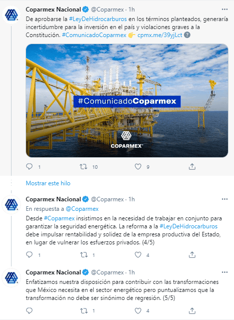 Este jueves, la Confederación Patronal de la República Mexicana (Coparmex) advirtió que de aprobarse la iniciativa para reformar la Ley de Hidrocarburos, impulsada por el Presidente Andrés Manuel López Obrador (AMLO) para favorecer a la paraestatal Petróleos Mexicanos (Pemex), causará incertidumbre para la inversión y genera conflictos. "Consideramos que de aprobarse en los términos planteados, generaría inaplicabilidad, conflicto de preceptos jurídicos y violaciones graves a la Constitución", agregó el ente en un boletín.Según la Coparmex, se debe "fortalecer al sector energético, pero creemos que solo será posible con el esfuerzo conjunto del Gobierno y el sector privado".La patronal consideró que la iniciativa privada "puede contribuir con experiencia y mejores prácticas internacionales", impulsando el sector energético y cumpliendo con el Estado de Derecho."Consideramos que estos lineamientos y objetivos también constituyen variables que impactarán positivamente en las empresas productivas del estado", subrayó.El Presidente López Obrador, envió el 26 de marzo a la Cámara de Diputados una iniciativa, con proyecto de decreto, para reformar y adicionar diversas disposiciones a la vigente Ley de Hidrocarburos.La iniciativa tiene como eje central devolver a la empresa estatal Petróleos Mexicanos(Pemex) el control de precios y llevar a cabo cambios en la transportación, distribución, comercialización, venta y almacenamiento de combustibles.Es considerada por expertos como una contrarreforma a la iniciativa de 2013 que abrió el sector petrolero a la iniciativa privada tras décadas de monopolio estatal."El proceso de reforma a la Ley de Hidrocarburos impulsada por el Ejecutivo Federal debe estar abierto tanto a la sociedad como a la opinión de expertos y debe ser precisa para evitar generar incertidumbre innecesaria en el sector", indicó Coparmex.Y advirtió riesgos como "vulneración del Estado de Derecho por disposiciones discrecionales", así como "posibles prácticas anticompetitivas" y el favorecimiento a Pemex "a costa de mayores precios o combustibles de menor calidad".Además, la Coparmex advirtió que la suspensión de actividades a empresas privadas que hayan sido sancionadas y su otorgamiento de estas instalaciones a Pemex "genera preocupaciones entre los inversionistas así como cuestionamientos sobre el Estado de Derecho, el respeto a las inversiones realizadas y los límites a la propiedad privada"."Insistimos en que la propuesta de reforma a la Ley de Hidrocarburos debe precisarse, de lo contrario generará incertidumbre en el sector", concluyó.López Obrador tiene un frente abierto contra las empresas privadas, especialmente extranjeras, del sector energético, a las que acusa de haber saqueado el país y puesto las empresas estatales al borde de la quiebra.Al igual que la suspendida Ley de la Industria Eléctrica que da prioridad la estatal Comisión Federal de Electricidad (CFE) por encima de los privados, la iniciativa para reformar Ley de Hidrocarburos señala que la participación del sector privado pone en riesgo la seguridad y economía del país.NR