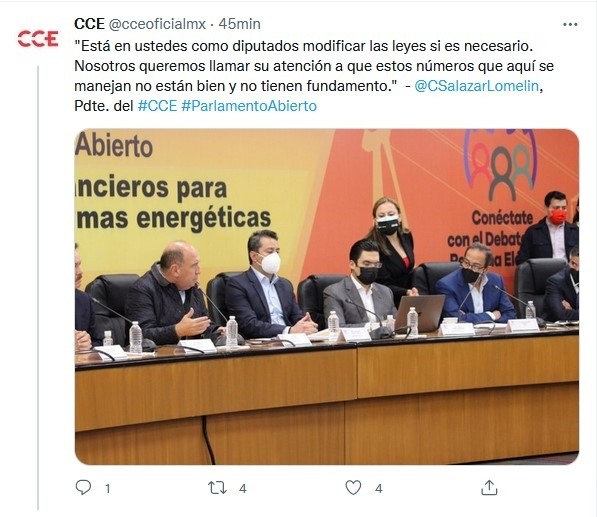 El Consejo Coordinador Empresarial (CCE) denunció este miércoles que hay 150 proyectos de energía limpia detenidos con un valor de 40 mil millones de dólares ante la incertidumbre de la política energética que impulsa el Gobierno."El sector privado está comprometido con México y con asegurar que las y los mexicanos tengamos suficiente energía barata y limpia. Hay más de 150 proyectos a futuro que equivalen a más de 40 mil millones de dólares de inversión que están ahora detenidos, y que el país necesita", declaró Carlos Salazar, presidente del CCE.El líder de la cúpula empresarial participó en el foro "Impactos económicos y financieros para la CFE y la hacienda pública de las reformas eléctricas" dentro del parlamento abierto del Congreso de la Unión para discutir la iniciativa del Presidente Andrés Manuel López Obrador (AMLO)."Que todos los mexicanos tengan acceso a suficiente energía barata y limpia. Queremos una Comisión Federal de Electricidad fuerte, vigorosa, eficiente, productiva y competitiva, pero esta propuesta de reforma no logra lo que el presidente quiere para México", opinó Salazar en el Congreso.En el foro, Miguel Reyes, director de CFE Energía, respondió que la empresa del Estado "subsidia", según él, a los generadores privados con 490 mil millones de pesos.También alegó que los privados producen 82 % de su energía con fuentes fósiles y son responsables del 52 % de las emisiones nacionales de dióxido carbono en el sector eléctrico.En cambio, el presidente del CCE aseveró que la CFE no ha hecho inversiones necesarias pese a recaudar 46 mil millones de pesos tan sólo de la tarifa de transmisión en 2021.Asimismo, reprochó que la reforma pretende regresar a México "a un modelo que ya está rebasado", pues la población mexicana casi se ha triplicado en las últimas décadas y la economía ha crecido al menos ocho veces.JM