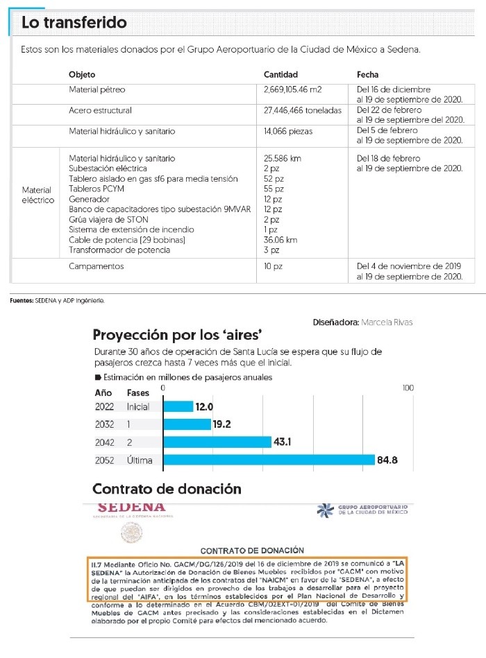 A dos años de la cancelación del Nuevo Aeropuerto Internacional de México (NAIM), el puerto aéreo de Santa Lucía no se puede explicar sin la donación de material de la fallida obra de Texcoco en favor de la Secretaría de la Defensa Nacional (Sedena) que usará acero, tezontle y prácticamente todo lo quiera, para edificar el Aeropuerto Internacional Felipe Ángeles (AIFA).Fue la noche del 28 de octubre de 2018 cuando se puso fin, con la ‘Consulta popular’ al aeropuerto en Texcoco, una obra impulsada por Enrique Peña Nieto y que fue calificada por el actual presidente, Andrés Manuel López Obrador, como un ‘barril sin fondo’.El Financiero obtuvo, a través de solicitudes de transparencia, información sobre el desmantelamiento del NAIM en Texcoco que, mediante un contrato de donación por parte del Grupo Aeroportuario de la Ciudad de México (GACM), cedió de forma gratuita tezontle, acero, material hidráulico, eléctrico y sanitario, además de campamentos, a la base aérea militar de Santa Lucía para su edificación a partir del 16 de diciembre de 2019 y hasta el 2021.Rogelio Rodríguez Garduño, doctor en Derecho Aéreo, opinó que la participación de las fuerzas armadas en la construcción del aeropuerto y la donación de los recursos, aunque sea legal, no abona al mensaje de transparencia proveniente de Palacio Nacional.“En el tema de transparencia no abona en lo absoluto, porque en los hechos la Sedena no está compuesta de albañiles o ingenieros, sino que subcontrata y en ese proceso hay una suerte de triangulación porque los que ejecutan la obra, los contratistas ya brincaron, es un puente que hace que se salten los procesos de licitación”, detalló Rodríguez.En el contrato, entregado vía la Plataforma Nacional de Transparencia, se señala que “los materiales (del NAIM) fueron donados por el Grupo Aeroportuario de la Ciudad de México”, una empresa de participación estatal mayoritaria, a “título gratuito y sin condiciones a la Sedena”.René Armas Maes, vicepresidente comercial y socio de MIDAS Aviation, firma de consultoría especializada de aviación en Londres, opinó que la cancelación del NAIM fue un error que impidió a México ser un referente de la aviación en los siguientes años.“La decisión de cancelar un megaproyecto como el del aeropuerto NAIM fue incorrecta. El aeropuerto fue diseñado para cumplir los requerimientos de crecimiento de demanda a futuro tanto para vuelos nacionales como internacionales con una capacidad de atención de pasajeros de tres veces mayor a la demanda registrada en el 2019”, refirió Armas Maes.La Sedena, encargada de Santa Lucía, refirió que, desde el 16 de diciembre de 2019, cuando inició el traslado al 19 de septiembre de este año, movilizó 2.7 millones de metros cúbicos de materiales pétreos, a través del Sindicatos Unidos y locales de transportistas, a un costo de cerca de 653.4 millones de pesos.De los restos del aeropuerto en Texcoco emerge poco a poco el puerto aéreo civil-militar y cuyo avance de obra llega ya al 40 por ciento.Con el acero estructural de Texcoco se construye la terminal de pasajeros y la torre de control del aeropuerto de Santa Lucía, que prevén será inaugurado el 21 de marzo del 2022.Según los documentos, a septiembre elementos militares movilizaron sin costo 27.4 millones de toneladas de acero. Sin embargo, el ejército no entregó información respecto al suministro de este material que Grupo Gilbert Estructuras en Aceros, que además es contratista para el aeropuerto Felipe Ángeles, le habría vendido.Gilbert, fue la ganadora para la compra de acero del NAIM en Texcoco, sin embargo, la operación se canceló por irregularidades en el proceso de licitación y la Sedena, que ahora es propietaria del acero reservó la información de dicha operación por cinco años, bajo el argumento de que estaba siendo auditada.“(Se) confirma y declara formalmente como información reservada los contratos firmados con Grupo Gilbert Estructuras en acero como proveedor del AIFA, permaneciendo con tal carácter por el término de cinco años”, señaló el documento firmado por el general brigadier Jorge Ramírez, titular de la Unidad de Transparencia del ejército mexicano.El material hidráulico y sanitario que fue llevado para Santa Lucía fue trasladado también por el ejército. A septiembre, se han movilizado 14 mil 66 piezas.Las fuerzas armadas también desmantelaron 10 campamentos de Texcoco para llevarlos a Santa Lucía y funcionarán como oficinas del personal que labora para el puerto aéreo.