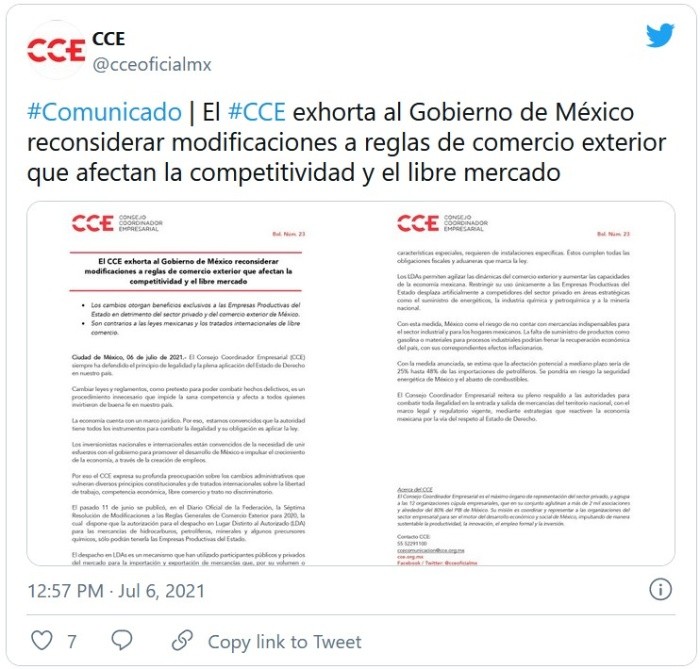 Los cambios a las reglas de comercio exterior en materia de hidrocarburos afectarán el abasto de combustibles en el país, además de que va contra las leyes mexicanas y los tratados de libre comercio en que participa México, dijo el Consejo Coordinador Empresarial (CCE).Por lo que el gobierno debe de reconsiderar y modificar la Séptima Resolución de Modificaciones a las Reglas Generales de Comercio Exterior para 2020 y así no ir contra el marco jurídico actual.Las medidas que entraron en vigor hace un mes afectarán a mediano plazo las importaciones de petrolíferos entre un 25% y 48%, lo que pondrá en riesgo la seguridad energética del país así como el abasto de combustibles."Con esta medida, México corre el riesgo de no contar con mercancías indispensables para el sector industrial y para los hogares mexicanos. La falta de suministro de productos como gasolina o materiales para procesos industriales podrían frenar la recuperación económica del país, con sus correspondientes efectos inflacionarios", afirmó el CCE.Ello porque el pasado 11 de junio se publicaron en el Diario Oficial de la Federación la Séptima Resolución de Modificaciones a las Reglas Generales de Comercio Exterior para 2020, en donde se limita a las empresas productivas del Estado el despacho de hidrocarburos, petrolíferos, minerales y algunos precursores químicos, en lugares distintos al autorizado.En otras palabras se impide a los privados llevar a cabo esa actividad con lo que "se desplaza artificialmente a competidores del sector privado en áreas estratégicas como el suministro de energéticos", químicos, petroquímicos y minerales.Es innecesario modificar leyes y reglamentos con el pretexto de que se combatirán ilícitos o hechos delictivos, porque se afecta a los que actúan de buena fe, dijo el CCE."El CCE expresa su profunda preocupación sobre los cambios administrativos que vulneran diversos principios constitucionales y de tratados internacionales sobre la libertad de trabajo, competencia económica, libre comercio y trato no discriminatorio", expuso.JM