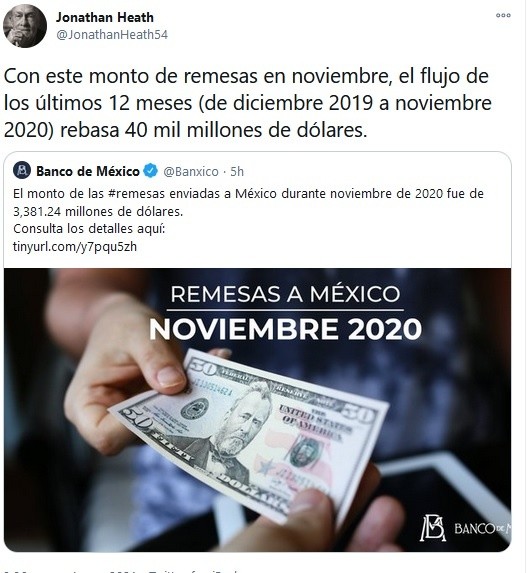 El Banco de México (Banxico) dio a conocer el dato de las remesas captadas durante noviembre del 2020 que alcanzaron un monto de tres mil 381 millones de dólares, un aumento de 15.6% en comparación a igual mes de 2019.El subgobernador de Banxico, Jonathan Heath, destacó en su cuenta de twitter que con este monto de remesas en noviembre el flujo de los últimos 12 meses, es decir de diciembre 2019 a noviembre 2020, rebasa los 40 mil millones de dólares.Banxico informó que en noviembre pasado, se registró un total de 9.7 millones de envíos, sobre todo por transferencia electrónica, lo que representó un incremento de 9.2 por ciento.En cada envío, los mexicanos que viven o trabajan, en especial en Estados Unidos, mandó a sus familiares en México un promedio de 348 dólares, un poco más respecto a los dos meses previos que fue de 341 en octubre y de 347 dólares en septiembre del 2020.De acuerdo con los datos del Banco Central, las remesas contabilizadas en efectivo o en especie fueron menores al monto enviado por transferencia electrónica, con 283 dólares en promedio.Si se compara el monto de los llamados "migradólares" con lo captado un mes antes, es decir en octubre pasado con tres mil 598 millones de dólares, se observa una baja.GC