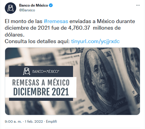 En 2021, México sumó un total de 51 mil 594 millones de dólares en remesas, una cifra récord. Esto representa un aumento del 27.06 % respecto a 2020, después de que en el último mes del año se recibieran cuatro mil 760.4 millones de dólares. El monto de remesas entre enero y diciembre pasado fue superior a los 40 mil 605 millones de dólares del mismo lapso de un año atrás, de acuerdo con el reporte mensual del Banco de México (Banxico). La remesa promedio del 2021 fue de 378 dólares, un 11.14% mayor que en el mismo lapso de 2020 -cuando fue de 340 dólares-, y el número de operaciones pasó de 119.4 a 136.5 millones de transferencias. La gran mayoría de los envíos fueron por transferencia electrónica. El pasado mes de diciembre, México reportó remesas por cuatro mil 760.4 millones de dólares, un 30.4 % superior a los tres mil 650 millones de dólares de diciembre de 2020. El país lleva varios meses registrando cantidades superiores a los cuatro mil millones de dólares por mes. En marzo de 2020, al comienzo de la pandemia del coronavirus en la región, superó también los cuatro mil millones de dólares, marcando entonces un primer récord. Este aumento sustancial de las remesas en 2021 sigue con la tendencia al alza marcada desde marzo del 2020.En plena pandemia del coronavirus, 2020 fue un año récord de remesas para México con 40 mil 605 millones de dólares, un aumento del 11.4% respecto a los 36 mil 438 millones de dólares de 2019. El Presidente de México, Andrés Manuel López Obrador (AMLO), ha agradecido en varias ocasiones a los 38 millones de mexicanos que hay en Estados Unidos, a los que califica de "héroes", al estimar que sus remesas benefician a cerca de 10 millones de familias pobres. El dinero, que procede principalmente de migrantes mexicanos que viven en Estados Unidos, representa la segunda fuente de divisas de México, después de las exportaciones automotrices. Por esa razón, el Gobierno de México confía en que las remesas ayuden a levantar la economía del país, que presentó una contracción del 8.2 % en 2020. Según cifras preliminares del Instituto Nacional de Estadística y Geografía (Inegi), la economía mexicana creció 4.8% en 2021, un dato menor al 6% que esperaba el Gobierno y que causó debate entre especialistas por una posible recesión tras la contracción en dos trimestres consecutivos. En 1995, el primer año del que ofrece resultados el Banco de México, las remesas fueron de tres mil 672 millones de dólares (ajustado al cambio actual).OF
