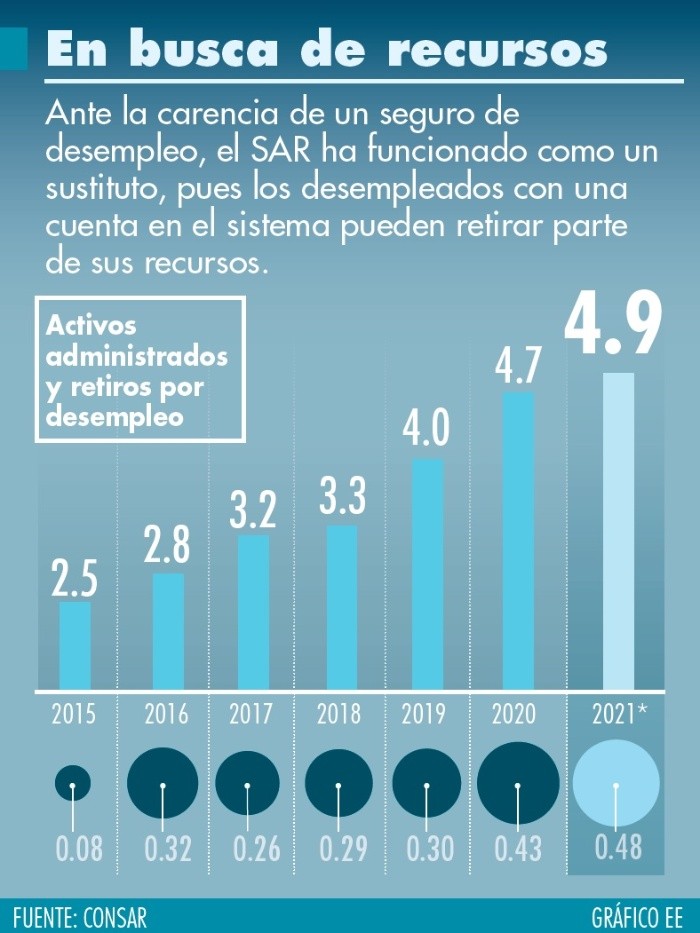 Las 10 administradoras de fondos para el retiro (afores) administran más de 4.9 billones de pesos, aproximadamente 21% del Producto Interno Bruto, de este total los retiros parciales por desempleo representan apenas 0.48% (23 mil 520 millones de pesos aproximadamente) en el periodo comprendido de mayo del 2020 a mayo del 2021, reveló la Comisión Nacional del Sistema del Ahorro para el Retiro (Consar).En este sentido, de ese 0.48%, solo 0.14% (alrededor de 7 mil 114 millones de pesos), se podrían atribuir como efecto de la pandemia de coronavirus. La Consar explicó que “a pesar del importante aumento de retiros por desempleo registrado por la pandemia, su impacto sobre el sistema es limitado, en gran parte debido al mismo diseño del programa que acota de manera importante el acceso y monto a estos retiros”.En el documento titulado “Impacto de la pandemia de Covid-19 en el mercado laboral mexicano y en el SAR”, publicado por la Consar, se detalla que del universo de más de 68 millones de cuentas registradas ante el órgano regulador solo 2.1 millones de personas (3.2% del total) realizaron un retiro parcial por desempleo de mayo del 2020 a mayo del 2021; estas operaciones significaron 6.6% de las cuentas activas en el 2020.El órgano regulador explicó que ante la carencia de un seguro de desempleo el Sistema de Ahorro para el Retiro (SAR) fue un “sustituto imperfecto” debido a que cualquier persona desempleada que tenga una cuenta en el sistema y cumpla con los requisitos puede acceder al derecho de retiro por desempleo.“Si bien el aspecto positivo de este mecanismo es mitigar la pérdida de ingreso en eventos negativos como la pandemia, el aspecto negativo significa una reducción en los saldos de las cuentas individuales y, por ende, en menores semanas cotizadas y menores pensiones futuras”, advirtió la comisión.No obstante, la reforma a la Ley del SAR (aprobada en diciembre por el Congreso) permitiría contrarrestar el efecto negativo porque el número de semanas requeridas para una pensión mínima se redujo de mil 250 a 750 semanas de cotización, para llegar a las mil semanas requeridas en el 2031, acotó la órgano regulador.Por otra parte, en todo el 2020 el saldo retirado bajo el concepto de retiro parcial por desempleo fue de 20 mil 060 millones de pesos y representó 0.43% de los activos netos. En el 2019, se retiraron 12 mil 031 millones de pesos y representó 0.30 por ciento. Finalmente, en el 2018 fueron retirados 9 mil 493 millones de pesos, esto es 0.29% de los activos netos, detalla la Consar. Asi, desde el 2018 se han realizado 5.3 millones de trámites de retiros por desempleo.Sin correlaciónPor su parte, Abraham Vela Dib, presidente de Comisión, señaló la semana pasada en conferencia de prensa, que hay analistas y expertos en la materia que han dicho que existe una correlación estrecha entre el comportamiento de los indicadores de empleo y el indicador del retiro parcial por desempleo porque suponen que los retiros obedecen a trabajadores que no están cotizando en el Instituto Mexicano del Seguro Social (IMSS).“Todos los trabajadores que cumplan con los requisitos de retiro por desempleo incluyen no solo a los trabajadores activos en el sector formal de la economía, sino también a trabajadores que hoy están en el sector informal y que hace muchos años habían cotizado al IMSS han permanecido en la informalidad, tienen un pequeño saldo de ahorro en su afore, pero ellos también aprovecharon este mecanismo para enfrentar los efectos de la pandemia”, comentó en su momento.En aquella conferencia de prensa, el titular de la Consar, comentó a los medios de comunicación que en algunos casos se había dramatizado el tema de los retiros parciales y puso ejemplo lo sucedido en Chile con el sistema de Administradoras de Fondos de Pensiones (AFP).Aproximadamente 9.5 millones de chilenos estarían encaminados a un cuarto retiro de dinero de las AFP; hasta el tercer retiro éstos ascendían a 40 mil millones de dólares. El monto retirado abarca desde el inicio de la pandemia en marzo, hasta junio del 2021.“(Esto) no tiene nada que ver con los 2 millones de retiros que se han producido a raíz de la pandemia”, dijo.Que sirva de aprendizajeLa Comisión espera que la pandemia de coronavirus deje diversas enseñanzas tanto en la vida social y económica de México; ante ello, hay que repensar herramientas que procuren a los trabajadores ante este tipo de eventualidades.“Sin duda habrá que repensar en los mecanismos de protección para el trabajador ante eventos similares y, para el SAR, seguir discutiendo los mejores mecanismos para blindar los recursos de los trabajadores y cumplir con el fin único del sistema que es el de otorgar las mejores pensiones posibles a los trabajadores al momento de su retiro”, acotó el informe.