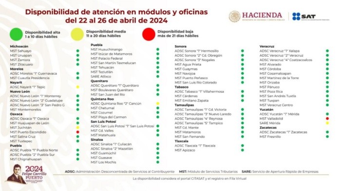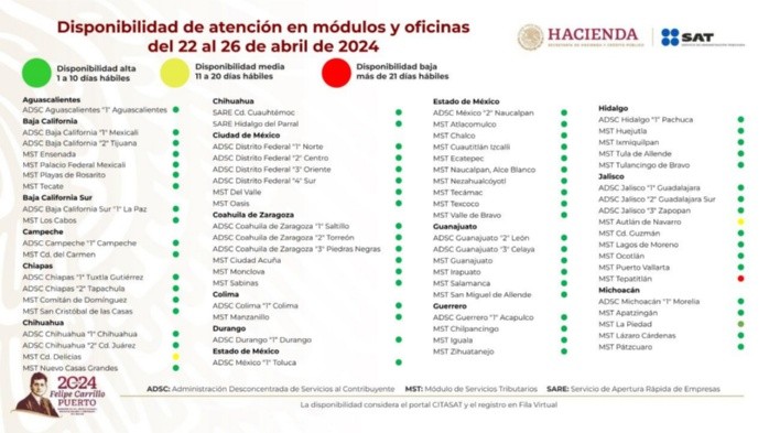 Durante la semana del 22 al 26 de abril, hay disponibilidad en prácticamente todas las oficinas del Servicio de Administración Tributaria (SAT) en México, según el indicador de citas disponibles, incluso en las oficinas afectadas por el huracán "Otis" en Guerrero el pasado octubre.En este último estado están en color verde, la Administración Desconcentrada de Servicios al Contribuyente de Guerrero 1 en Acapulco, y los Módulos de Servicios Tributarios en Chilpancingo, Iguala y Zihuatanejo.Cabe recordar que todos los trámites en el SAT son gratuitos, por lo que la misma dependencia invitó a los contribuyentes a denunciar en caso de que les vendan una cita.Solamente se necesita ir de manera presencial al SAT cuando se va a realizar el trámite para la inscripción al Registro Federal de Contribuyentes (RFC) y para la generación de la firma electrónica.Aquellos causantes que ya tienen RFC y e.firma, pueden realizar cualquier trámite en el portal del órgano recaudador de impuestos, en la oficina virtual o por medio de la aplicación SAT ID.Para la atención de personas de la tercera edad o con alguna discapacidad, y mujeres embarazadas o con menores lactantes, no se requiere sacar cita para hacer alguna gestión ante las oficinas del fisco.Finalmente, el SAT reiteró que para facilitar la presentación de la Declaración Anual 2023 de personas físicas, se recuerda que el horario en las oficinas se amplía de 8:30 a 18:00 horas, hasta el 30 de abril. YC