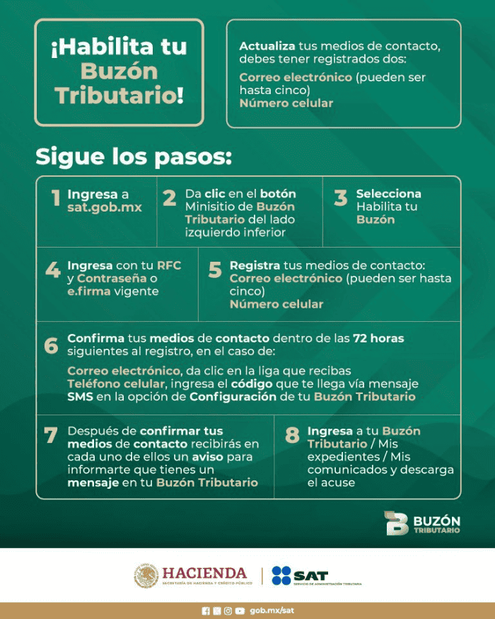 El Servicio de Administración Tributaria (SAT) cuenta con una herramienta denominada Buzón Tributario, la cual se trata de un canal de comunicación entre el SAT y los contribuyentes, y tiene como objetivo simplificar la notificación de actos administrativos y envío de mensajes de interés de manera ágil y segura.La activación de esta herramienta se volvió una obligación más de los contribuyentes desde el 2020 y el no habilitarlo propiciaría que las personas sean acreedoras a algún tipo de multa. Es así que el SAT ha puesto como fecha límite de activación del Buzón Tributario el 31 de diciembre de 2023.Si eres de los contribuyentes que aún no ha dado de alta su Buzón Tributario o no sabes cómo activarlo, a continuación compartimos contigo los pasos a seguir para hacerlo de manera efectiva.A través de la red social X, el Servicio de Administración Tributaria compartió con la ciudadanía los sencillos pasos a seguir para poder activar esta herramienta. Para llevar a cabo el proceso lo que debes hacer es acceder al portal web oficial de la institución en sat.gob.mx.Y listo, tras seguir estos sencillos pasos ya tendrás habilitado tu Buzón Tributario del SAT. Esta institución también le recuerda a aquellos contribuyentes que ya tengan activa la herramienta que actualicen sus medios de contacto.YC