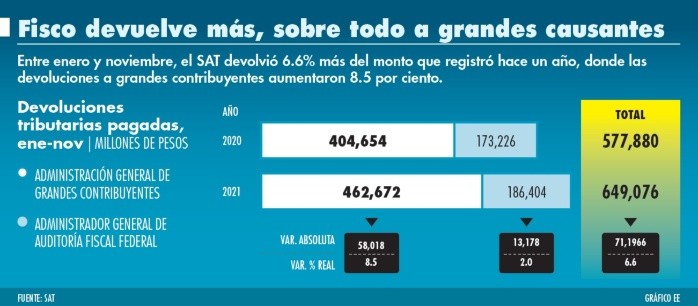 De las devoluciones que realizó el Servicio de Administración Tributaria (SAT), en el periodo de enero a noviembre de este año, la mayoría fueron a grandes contribuyentes, de acuerdo con las cifras preliminares del fisco.El órgano recaudador reportó que de enero a noviembre las devoluciones totales pagadas fueron por 649 mil 076 millones de pesos, lo que significó un incremento de 6.6% respecto al mismo periodo del año pasado.“En enero-noviembre del 2021 se pagaron 649 mil 076 millones de pesos en devoluciones tributarias, 250 mil 348 millones de pesos más que en el mismo periodo del 2018, equivalentes a un incremento real de 43.9 por ciento. En comparación con enero-noviembre del 2020, el incremento fue de 71 mil 196 millones de pesos, esto es 6.6% real más”, destacó el fisco.De este monto total pagado, 71% lo reportó la Administración General de Grandes Contribuyentes, es decir, 462 mil 672 millones de pesos. El SAT también informó que este monto aumentó 8.5% anual, aún más que las devoluciones totales.Los 186 mil 404 millones de pesos restantes fueron las devoluciones a contribuyentes que reportó la Auditoría General de Auditoría Fiscal Federal. Estas devoluciones presentaron un alza de 2.1% en comparación con enero a noviembre del 2020.Afecta recaudaciónDe acuerdo con el SAT, el saldo de las devoluciones tuvo un efecto en la recaudación de impuestos. De enero a noviembre, el fisco informó que recaudó 3.2 billones de pesos, esto es 0.8% más a tasa anual.Al detalle, se observó que las contribuciones internas dejaron 2.3 billones de pesos, una reducción anual de 2.3 por ciento.Esta reducción, abundó el SAT, se debe al incremento en las devoluciones, destaca la de los saldos de los grandes contribuyentes con operaciones de comercio exterior, particularmente de la industria manufacturera, comercio al por mayor y minería.“Aunque estas devoluciones se asocian a operaciones de comercio exterior, contablemente se descuentan a las contribuciones internas”, dijo el SAT.En tanto, los ingresos que se obtuvieron por comercio exterior sumaron 904 mil 047 millones de pesos, 9.7% más que el año pasado.“Las contribuciones de comercio exterior crecieron 9.7% real. Sin embargo, a pesar de la reactivación económica, todavía se encuentran 7% real por debajo del nivel alcanzado en el mismo periodo del 2019, previo a la pandemia”, abundó.Lo anterior, señaló el SAT, se debe a diferentes problemáticas como el contrabando, afectaciones en la logística del intercambio internacional de mercancías e incertidumbre ante nuevas cepas del COVID-19.El año pasado, la recaudación por comercio exterior se vio sumamente afectada por las restricciones de movilidad y confinamiento, lo que impactó en la recaudación.Resoluciones en 17.8 díasEl SAT destacó que el tiempo promedio de resolución favorable de las devoluciones, en los primeros 11 meses del año, disminuyó en 3.4 días frente a lo que se tenía el año pasado.Ahora los contribuyentes deben esperar, en promedio, 17.8 días para que se resuelva su devolución; el año pasado le espera era de 21.2 días.“Para Grandes Contribuyentes el tiempo de resolución favorable se incrementó cinco días debido a que este año entró en vigor una modificación a las Reglas Generales de Comercio Exterior que elimina el beneficio de tiempos de devolución de las empresas IVA e IEPS certificadas”, explicó el SAT.
