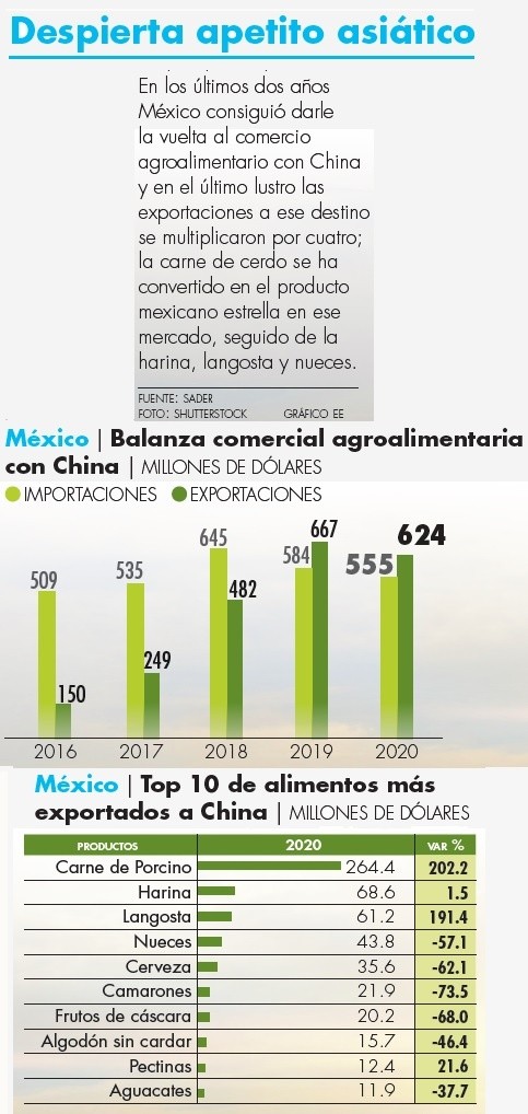 En el último lustro las exportaciones alimentarias de México hacia China han crecido 15.6% en promedio cada año, pero ese ritmo podría duplicarse este o el próximo año, pues se prevé que el país asiático dé el visto bueno para la entrada de más productos mexicanos, afirmó Víctor Villalobos, titular de la Secretaría de Agricultura y Desarrollo Rural (Sader).El aval a la exportación mexicana de estos productos animales se sumaría al del sorgo, pues se trata de una de las materias primas básicas para la destilación del aguardiente más popular en el país asiático.“Hemos crecido 15.6% cada año en los últimos cinco años (en exportaciones a China). Al doblar ese porcentaje nuestra participación en el mercado chino seguiría siendo pequeña, pero crecer a ese ritmo podría ser una de nuestras metas y si se logra esa apertura (del mercado de vísceras), el 15% adicional en términos de crecimiento se puede lograr”, explica en entrevista el titular de Sader, que atiende al único sector de la economía mexicana –el primario– que creció el año pasado.Hablar del potencial del campo mexicano en la conquista de los paladares asiáticos es algo que entusiasma a Víctor Villalobos y no es para menos, pues se trata del mayor mercado alimentario del mundo, empezando por China y sus mil 400 millones de consumidores que cada año compran alimentos del exterior con un valor de unos 151 mil millones de dólares, de los cuales cual México se agencia apenas 0.4%, por lo que el potencial de crecimiento es superlativo. Si bien esa tajada del mercado suena a poco, en términos de las exportaciones alimentarias mexicanas ha ido ganando notoriedad. El año pasado, México envió productos a China por 624 millones de dólares e importó alimentos de ese origen por otros 555 millones, por lo que obtuvo un superávit por segundo año consecutivo, situación inédita.Además, en el 2016 las exportaciones alimentarias mexicanas a China pesaron 0.5% de las exportaciones alimentarias totales, mientras que en el 2020 esa proporción creció a 1.6 por ciento.Esta participación se ha conseguido con el tesón del gobierno y productores, pues a diferencia de otros países latinoamericanos como Perú, Colombia o Chile, México no tiene un acuerdo comercial con China, por lo que su acceso a ese mercado ha sido a punta de negociar producto por producto.“No contamos con TLC y nuestras negociaciones están supeditadas a esos arreglos caso por caso, pero en función del prestigio que tienen nuestros productos. Hoy las relaciones con China son inmejorables y ha crecido la cooperación técnico-científica”, explicó Villalobos.Detrás de la aprobación para exportar cada producto está el trabajo del Servicio Nacional de Sanidad, Inocuidad y Calidad Agroalimentaria (Senasica), que ha sido clave para que “el mercado chino haya aprendido a valorar la calidad e inocuidad de nuestros productos”.Gracias a ese reconocimiento, México ha conseguido abrir mercados como el del aguacate (2005) la carne de cerdo (2008), las frutillas (2014), la harina de maíz (2015) o el sorgo (2020) y este año, adelantó Villalobos, es muy probable que se consiga el acceso a la venta de las ya referidas vísceras.El titular de la Sader reconoció también la labor de promoción de los productores aglutinados en el Consejo Nacional Agropecuarios (CNA). Admitió que debido a la austeridad de este gobierno no ha sido posible ya apoyar esta labor contribuyendo con gastos para la asistencia a ferias internacionales, pero enfatizó que la mayor aportación del gobierno es con los bienes públicos que provee con los servicios del Senasica o el Inifap, instancias para las que la Sader destina presupuestos.