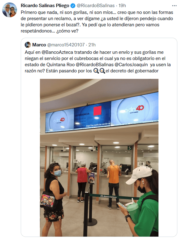 El dueño de Grupo Salinas, Ricardo Salinas Pliego, defendió a sus empleados luego de que una clienta de Banco Azteca se quejara e insultara a los trabajadores, quienes le negaron el acceso a una sucursal por no llevar cubrebocas.De acuerdo con el usuario en Twitter, Marco, el día de ayer acudió a una sucursal de Banco Azteca en Quintana Roo para hacer un envío, sin embargo, los empleados de ese lugar le negaron el servicio por no llevar cubrebocas, a lo que él respondió que ya no es obligatorio en esa entidad.Además, calificó de "gorilas" a los trabajadores de ese banco."Aquí en Banco Azteca tratando de hacer un envío y sus gorilas me niegan el servicio por el cubrebocas el cual ya no es obligatorio en el estado de Quintana Roo @RicardoBSalinas @CarlosJoaquin ya usen la razón no? Están pasando por los el decreto del gobernador", escribió el usuario de Twitter.Tras la queja, el empresario no lo pensó dos veces, salió en defensa de sus empleados y exhortó al usuario inconforme presentar su reclamo sin faltar el respeto."Primero que nada, ni son gorilas, ni son míos… creo que no son las formas de presentar un reclamo, a ver dígame ¿a usted le dijeron pen---- cuando le pidieron ponerse el cubrebocas?. Ya pedí que lo atendieran pero vamos respetándonos… ¿cómo ve?", escribió el dueño de Tv Azteca.El pasado 10 de mayo, el gobernador de Quintana Roo, Carlos Joaquín González, anunció que el uso del cubrebocas en el estado sería voluntario.A través de redes sociales, el mandatario estatal recomendó utilizar el cubrebocas en transporte público, aglomeraciones y al personal de servicio durante su jornada laboral, además a las personas con comorbilidades."El actual contexto sanitario nos ofrece certeza respecto al comportamiento del virus, ya que llevando más de cinco semanas sin defunciones y un promedio de menos de 20 contagios por día."Esta estabilidad se refleja en un semáforo verde sostenido, a lo largo de los últimos meses, por lo que vamos a tener el gusto de poder anunciar, este 10 de mayo, que el uso del cubrebocas en la entidad es voluntario", dijo Carlos Joaquín.OA