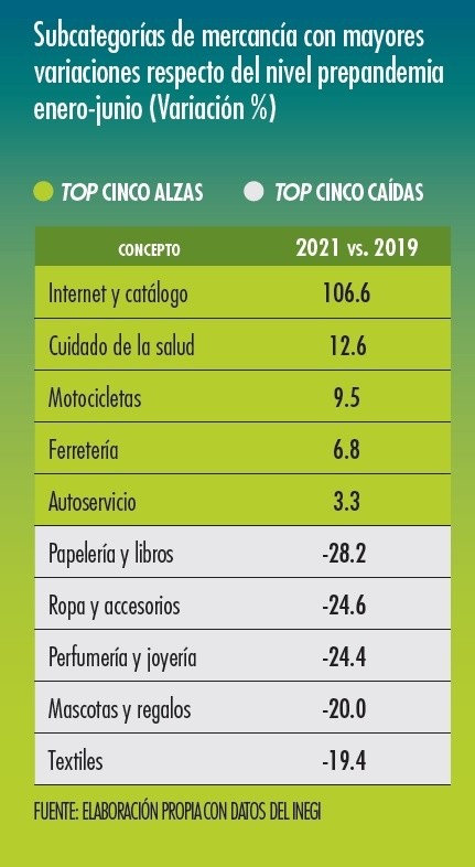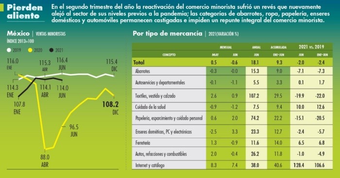 En junio pasado el comercio minorista en México cerró un segundo trimestre del 2021 de franco estancamiento, poniendo pausa al ritmo de reactivación que poseía tras el parón económico de abril y mayo del año pasado por el confinamiento anti COVID.Durante el sexto mes del año las ventas al menudeo cayeron 0.6% en comparación con mayo, cuando habían crecido 0.5%, de acuerdo con cifras desestacionalizadas divulgadas ayer por el Instituto Nacional de Geografía y Estadística (Inegi).Se trató del segundo revés del segundo trimestre del año –en abril se registró una contracción de 0.4%–, lo que colocó el nivel de ventas en su segunda peor posición para un mes de junio desde el 2017 (solo el 2020 fue peor por el efecto del confinamiento anti COVID).Desde otra perspectiva, las ventas minoristas han vuelto a alejarse de su nivel previo a la pandemia, luego del acercamiento que tuvieron durante el primer trimestre del año. En junio, los ingresos minoristas se colocaron 2% por debajo del monto del mismo mes del 2019, cuando en marzo la baja bianual llegó a ser de apenas 0.3 por ciento.“El resultado estuvo por debajo de la expectativa de -0.3% mensual del consenso, lo que muestra cierto desgaste para el consumo luego de que registrara tasas de crecimiento espectaculares en la primera parte del año”, destacó en una nota informativa Marcos Arias, analista de Grupo Financiero Monex.En junio 10 de las 22 categorías de mercancías cuyas ventas al menudeo monitorea el Inegi tuvieron retrocesos mensuales, destacando la de motocicletas y otros vehículos de motor (-13%), la de tiendas departamentales (-7.5%), artículos para el esparcimiento (5.3%), calzado (-1.9%), artículos para el cuidado de la salud (-1.2%) y tiendas de autoservicio (-1 por ciento).Por el contrario, destacó el avance las ventas a través de Internet, catálogo y por televisión (+7.4%), al que siguieron las mejoras en artículos de perfumería y joyería (+5.2%), mobiliario, computadoras y teléfonos (+4.7%), mascotas y regalos (+4%), artículos de decoración (+2.7%) y muebles (+2.4 por ciento).Para Ángel Huerta, analista del Grupo Financiero Ve por Más, la baja global de las ventas en junio y durante el segundo trimestre en general está relacionada con la normalización del gasto de los consumidores, que paulatinamente están incluyendo más servicios en su canasta de consumo –debido a menores restricciones anti Covid–, lo que desplaza la compra de bienes en alguna medida.“Las medidas para frenar los contagios continuaron relajándose, permitiendo una reapertura de las actividades más amplia, que a su vez propició que los patrones de consumo sigan normalizándose, rotando de bienes hacia servicios”, opinó.Justamente esa mejora del gasto en servicios habría compensado en alguna medida el estancamiento de las ventas minoristas en el consumo privado, a la luz del crecimiento trimestral de 1.5% de la economía mexicana, en donde destacó el avance de 2.1% de las actividades terciarias.“La publicación de las estadísticas de las ventas al por menor fortalece la perspectiva de que fue la reapertura generalizada de los servicios, sobre todo de los vinculados al turismo y al esparcimiento, lo que posibilitó el crecimiento dinámico de la economía en el segundo trimestre”, apuntó Marcos Arias, de Monex.Por otro lado, campañas promocionales como la del Prime Day de Amazón –celebrada el 21 y 22 de junio– pudo haber impulsado el notable desempeño de las ventas por Internet, categoría que hiló dos meses siendo la más dinámica dentro de la medición que hace el Inegi, apuntó por su parte Juan Carlos Alderete, director de Análisis Económico de Grupo Financiero Banorte. Entre enero y junio pasados, los ingresos minoristas crecieron 9.3% en comparación con el primer trimestre del 2020.Si te interesó esta noticia y quieres saber más, entonces descarga y descubre INFORMAPlus, la aplicación digital de EL INFORMADOR, en donde tenemos contenidos exclusivos, seleccionados por nuestros editores, para darles una experiencia más completa a los lectores.Descarga la aplicación y pruébala GRATIS por treinta días.Para iOS: https://apple.co/35jaVgb Para Android: https://bit.ly/3gwVSEVSi eres suscriptor de EL INFORMADOR tu acceso está incluido, solicítalo al 33 3678-7777.