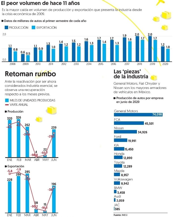 En junio aumentó casi 11 veces más la producción de autos en México y 13 veces la exportación en comparación con mayo pasado, resultado de la reactivación del sector al ser considerado como industria esencial en medio de la pandemia de coronavirus COVID-19. En conferencia, Fausto Cuevas, director general de la Asociación Mexicana de la Industria Automotriz (AMIA), señaló que aún deben estar atentos a lo que suceda en los siguientes meses porque de eso dependerá la recuperación del sector. “Estamos pasando por una coyuntura complicada en todos los mercados de Norteamérica, pero observamos una reactivación y la recuperación dependerá de las medidas que se tomaron para la apertura a la nueva realidad”, agregó. En junio, se produjeron en México 238 mil 946 unidades, una caída de 29.2 por ciento frente a lo registrado en igual periodo de 2019, pero es una desaceleración respecto a las bajas de 98.8 y 93.7 por ciento de abril y mayo, respectivamente. Mientras que la exportación disminuyó 38.8 por ciento, al ubicarse en 196 mil 173 unidades; una mejor variación frente a lo registrado en abril cuando bajó 90.2 por ciento y en mayo que cayó 95.1 por ciento. A mediados de mayo de este año, las autoridades federales en México consideraron al sector automotor dentro de las industrias esenciales en medio de la pandemia de coronavirus, por lo que pudieron reiniciar actividades a principios de junio. “La industria automotriz es un motor de México y nuestro compromiso es continuar siendo protagonistas activos en la siguiente etapa posterior al COVID-19 (…) Sin embargo, esto no significa que en los próximos seis meses se recupere la industria, tomará más tiempo que el sector se recobre de esta pandemia”, agregó Cuevas. Incluso con la reapertura, hay empresas que trabajan con una parte de su capacidad productiva en lo que se acoplan a la “nueva realidad” y la demanda global de autos que se mantiene deprimida por la crisis económica que causó la pandemia. General Motors fue la armadora que más produjo vehículos en junio con 74 mil 98 unidades, 4.8 por ciento inferior a lo reportado en el mismo periodo del año pasado, le siguió Fiat Chrysler Automobiles (FCA) con 45 mil 501 autos, 18.9 por ciento debajo de lo registrado en el sexto mes de 2019. Estas empresas reiniciaron su producción desde finales de mayo. En cuanto a la exportación, la firma que más coches mandó al exterior también fue General Motors con 67 mil 486 autos, 12 por ciento debajo de lo reportado en junio de 2019, mientras que FCA exportó 31 mil 129 autos, una reducción de 42.2 por ciento menor a lo que lograron en el mismo lapso del año pasado.En cifras acumuladas entre enero y junio de 2020, se produjeron en México un millón 173 mil 180 autos, un desplome de 40.8 por ciento en comparación con lo reportado en el mismo periodo del año pasado, la mayor caída desde la crisis económica global de 2009. Mientras que, en el primer semestre del año, se exportaron un millón 18 mil 419 autos, 41.7 por ciento inferior a lo registrado en igual lapso de 2019, también la mayor caída en 11 años.Afinan T-MEC A partir del primero de julio comenzó la aplicación del Tratado Comercial México, Estados Unidos y Canadá (T-MEC); sin embargo, siguen revisándose algunas dudas entre equipos negociadores de los tres países para evitar malas interpretaciones, dijo Fausto Cuevas, director general de AMIA. “Hay una serie de precisiones que se deben revisar para su interpretación y aplicación, esto debe suceder en los siguientes días”, explicó. Agregó que la mayoría de las armadoras solicitaron su ingreso al régimen alternativo de cumplimiento de regla de origen de hasta 5 años. “No creo que estas situaciones afecten su exportación a Estados Unidos”, agregó Cuevas. La Secretaría de Economía abrió la posibilidad de que, si 10 por ciento o más de la producción total de una empresa en el país no cumple con las nuevas reglas de origen, le darán cinco años para cumplir con este requerimiento. Se arreglan con la Ciudad de México Sobre la suspensión de emplacamiento en la Ciudad de México, Guillermo Rosales, director general adjunto de la Asociación Mexicana de Distribuidores de Automotores (AMDA), señaló que esto afecta la operación de los distribuidores en la capital del país. Pero destacó que esto fue por la interrupción temporal de labores por parte del gobierno de la capital por la pandemia, y que su plataforma digital presentó problemas. “Pero en estos momentos ya se han superado la mayoría de los problemas y seguimos con la autoridad afinando el uso de estas herramientas (digitales)”, destacó.