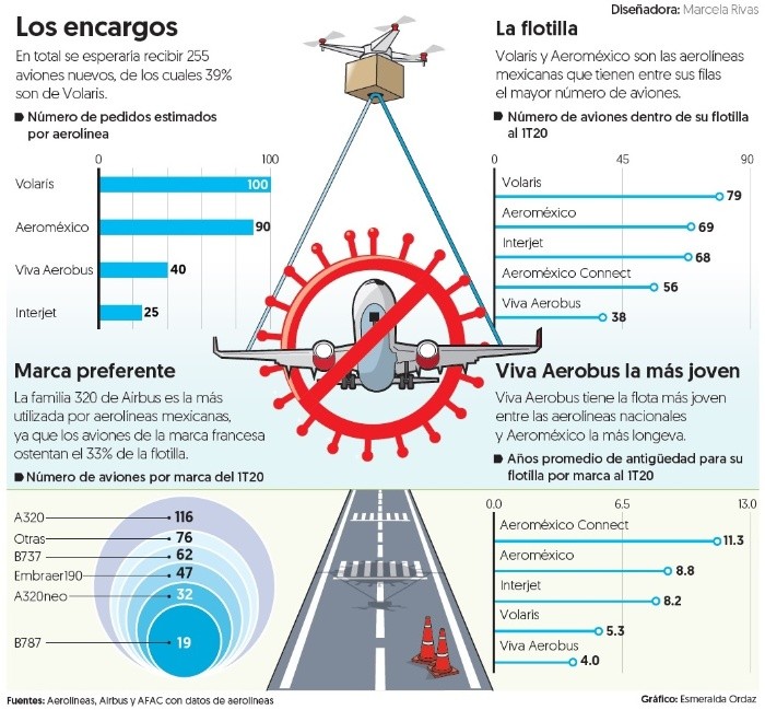 La crisis sanitaria derivada de la pandemia del coronavirus no sólo tiró la demanda de vuelos, sino que frenó la producción de aeronaves y obligó a las aerolíneas a renegociar y postergar los pedidos de aviones. Volaris, Interjet y Viva Aerobus renegociaron con los arrendadores y los fabricantes para retrasar la llegada de aviones que habían pedido en los años anteriores, debido al impacto del coronavirus en la industria. Mientras que Grupo Aeroméxico –que se encuentra en un proceso de reestructura financiera bajo la protección del Capítulo 11 de la ley de Quiebras de Estados Unidos– pidió a la Corte autorización para devolver 19 aeronaves y cuatro motores, lo que significaría suspender algunos contratos de arrendamiento. El principal proveedor de aeronaves para aerolíneas mexicanas, Airbus, informó que en la próxima década tiene un pedido de 175 unidades para firmas en el país, cuyas entregas se han diferido. “Cada aerolínea tiene órdenes y temas diferentes, hay aerolíneas que han pedido ciertos movimientos, otras que están devolviendo aviones, no puedo generalizar: cada aerolínea es un mundo en cuanto a su perfil de entregas y en cuanto a sus devoluciones de aviones que tienen en operación hoy en día”, señaló en entrevista con El Financiero, Arturo Barreira, presidente de Airbus para América Latina y el Caribe. Agregó que, la producción de los aviones de la familia 320 –que son los que las aerolíneas mexicanas operan– disminuyó 33 por ciento debido a la pandemia, ya que, hasta antes del inicio de la crisis sanitaria, ensamblaban 60 aviones mensuales y ahora sólo 40, por lo que esto ocasionará que las entregas a las aerolíneas sean diferidas. “Estamos produciendo 40 aviones del modelo 320 al mes, con lo cual hay un movimiento de entregas anual sobre los próximos meses, obviamente, los que tengan entrega en el corto plazo se van a diferir”, dijo Barreira. Por su parte, el principal proveedor de Aeroméxico, Boeing, reanudó a finales de mayo la producción del 737 MAX, que lleva año y medio sin volar debido a dos accidentes fatales. Aeroméxico tenía, hasta antes de la pandemia, pedidos por hasta 90 aeronaves de este tipo. Viva Aerobus decidió postergar La aerolínea dirigida por Juan Carlos Zuazua tiene alrededor de 40 aeronaves pendientes de entregar en la siguiente década, de acuerdo con información del fabricante francés. Aunque para este año, la aerolínea de bajo costo tiene presupuestada la entrega de cinco equipos –tres A321neo y dos A320neo–, la empresa postergó un año más las entregas previstas para el siguiente lustro. “El número de aeronaves solicitadas en dichos pedidos se mantiene, únicamente se han ajustado las fechas de entrega de las mismas de acuerdo con la capacidad del fabricante en el contexto de la pandemia y la reactivación de vuelos en función de la demanda de pasajeros”, respondió la aerolínea a una solicitud de información de El Financiero. Interjet regresa aviones La línea aérea recibió 150 millones de dólares para recapitalizarse y poder hacer frente a sus obligaciones con sus proveedores, entre los que se encuentra Airbus. En los siguientes diez años, el fabricante francés prevé entregar a la aerolínea más de 25 equipos A320 para aumentar la capacidad de la aerolínea, que en meses pasados tuvo que devolver algunos aviones a sus arrendadores debido a sus complicaciones financieras. “El nuevo plan de operaciones considera la reincorporación, en los próximos días, de más aeronaves Airbus 320 y 321, con lo cual se refrenda el compromiso con la conectividad aérea del país”, señaló la aerolínea de la familia Alemán. Volaris mantendrá igual su flota tres años La línea aérea de bajo costo tiene, según información de Airbus, más de 100 aeronaves pendientes de entrega para la siguiente década, convirtiéndose en la empresa con mayor crecimiento previsto en cuanto a su capacidad. Sin embargo, la pandemia ha obligado a Volaris a replantear su esquema de recepción de aeronaves. En entrevista, Beltranena puntualizó que en los próximos tres años la línea aérea mantendrá su flota sin crecimiento en términos netos, pero estará pendiente para ir al mercado secundario de aeronaves para, en caso de requerirlo, aumentar su capacidad. “Aviones en el mercado va a haber muchísimos y a un muy buen precio, eso nos deja una flexibilidad de crecer si queremos crecer y el mercado nos lo permite, de ir hacia adelante con una capacidad financiera de adquisición de flota mucho mejor”, dijo Beltranena en entrevista. Aeroméxico devuelve naves Las dificultades del ‘caballero águila’ han crecido. Antes de la pandemia tenía problemas con la entrega de los 737 MAX de Boeing, que suspendió las entregas debido a dos accidentes fatales que llevaron al fabricante estadounidense a realizar cambios en el que sería su avión ‘estrella’. El Financiero consultó a Aeroméxico, quien dijo no tener información sobre cambios en el pedido de esas aeronaves. Pese a ello, en su primer informe trimestral, la aerolínea informó la cancelación de nuevos pedidos de aeronaves.