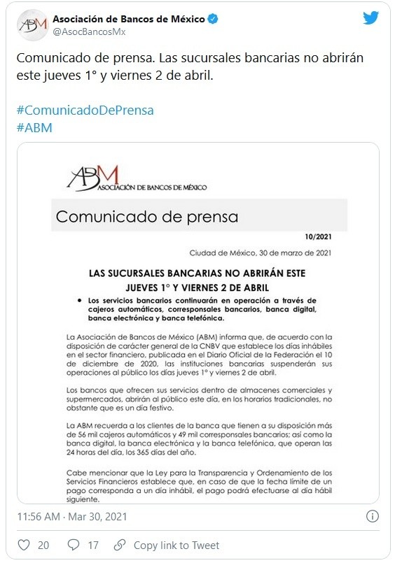 La Asociación de Bancos de México (ABM) informó que, de acuerdo con la disposición de carácter general de la Comisión Nacional Bancaria y de Valores (CNBV) que establece los días inhábiles en el sector financiero, publicada en el Diario Oficial de la Federación el 10 de diciembre de 2020, las instituciones bancarias suspenderán sus operaciones al público este jueves 1 y viernes 2 de abril.De acuerdo con la CNBV, los bancos que ofrecen sus servicios dentro de almacenes comerciales y supermercados abrirán al público estos días, en los horarios tradicionales, a pesar de ser días festivos."La ABM recuerda a los clientes de la banca que tienen a su disposición más de 56 mil cajeros automáticos y 49 mil corresponsales bancarios; así como la banca digital, la banca electrónica y la banca telefónica, que operan las 24 horas del día, los 365 días del año", dijo el organismo.Cabe recordar que la Ley para la Transparencia y Ordenamiento de los Servicios Financieros establece que, en caso de que la fecha límite de un pago corresponda a un día inhábil, el pago podrá efectuarse al día hábil siguiente.JM