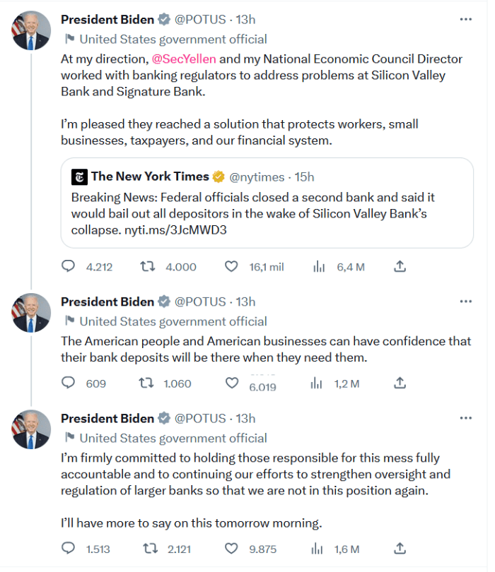 El presidente de Estados Unidos, Joe Biden, mandó un mensaje de tranquilidad este lunes a los estadounidenses al recalcar que el sistema bancario del país "es seguro" y aseguró a los clientes de los bancos Silicon Valley Bank y Signature Bank que tendrán sus depósitos."Sus depósitos estarán ahí cuando los necesiten", dijo en una breve intervención ante la prensa un día después de que los órganos reguladores lanzaran un plan para proteger los depósitos del Silicon Valley Bank (SVB) tras su colapso y cerraran otra institución bancaria, el Signature Bank, bajo los mismos parámetros."Los estadounidenses pueden tener confianza en que el sistema bancario es seguro. (...) En mi Administración nada ni nadie está por encima de la ley", recalcó el mandatario asegurando que el contribuyente no asumirá ninguna pérdida.El SVB, con sede en California, anunció el pasado miércoles que iba a buscar una ampliación de capital para tratar de hacer frente a dificultades financieras que le habían llevado a deshacerse de inversiones por valor de unos 21 mil millones de dólares, con una pérdida de unos mil 800 millones.Ese anuncio llevó a muchos clientes a retirar sus fondos, tras lo que los reguladores tuvieron que cerrar el banco el viernes por falta de liquidez. Posteriormente se hundió la cotización bursátil de la compañía, lo que a su vez afectó al sector bancario en Estados Unidos y otros países.El Departamento del Tesoro, la Reserva Federal (Fed) y la Corporación Federal de Seguro de Depósitos (FDIC) anunciaron el domingo que los clientes tendrán acceso a partir de este lunes a todo el dinero depositado en el SVB y prometieron un plan similar para el Signature Bank.Biden avanzó que los gestores de esos bancos "serán despedidos" y recalcó, tal y como habían apuntado los reguladores la víspera, que los accionistas no estarán protegidos."Si la FDIC se hace cargo del banco, las personas que lo administran ya no deberían trabajar allí. (...) Los inversores no estarán protegidos. Se arriesgaron a sabiendas y cuando el riesgo falla los inversores pierden su dinero. Así es como funciona el capitalismo", dijo.Su comparecencia intentó disipar los fantasmas de la crisis financiera de 2008."Debemos reducir el riesgo de que esto suceda de nuevo", recalcó el mandatario, recordando que bajo la Administración del también demócrata Barack Obama (2009-2017) se pusieron en marcha "duras exigencias" al sector bancario que retrocedieron en la del republicano Donald Trump (2017-2021).Por ello, señaló que va a solicitar al Congreso y a los reguladores que refuercen las reglas para reducir las posibilidades de que este tipo de colapso suceda de nuevo y para proteger los empleos y los pequeños negocios."La conclusión es la siguiente: Nuestro sistema bancario es seguro. Sus depósitos están seguros. Haremos lo que tengamos que hacer", añadió Biden, dejando claro que el dinero para asumir las pérdidas del SVB y del Signature Bank procederá de las tasas que los bancos ingresan al Fondo de Garantía de Depósitos.JM