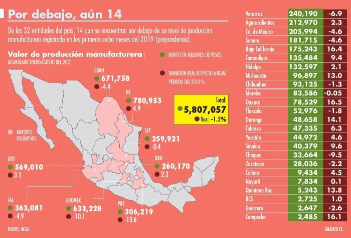 De los estados con mayor valor de producción manufacturera del país, Nuevo León y Guanajuato fueron los únicos que lograron rebasar los niveles registrados antes de la pandemia de COVID-19.Según datos del Instituto Nacional de Estadística y Geografía (Inegi), Nuevo León fue la entidad con el valor más alto en producción manufacturera, con 780 mil 953 millones de pesos corrientes en los primeros ocho meses del 2021, monto 4.9% superior, en términos reales, al registro de igual periodo del 2019, lapso prepandémico.Lo anterior significa que el estado fronterizo ya superó los estragos que trajo consigo la contingencia sanitaria.Detrás de Nuevo León se ubicó Coahuila, con un valor de 671 mil 758 millones de pesos, pero con 4.4% inferior a lo reportado hace dos años. El podio lo completa el Estado de México al mostrar 633 mil 228 millones de producción manufacturera y una contracción de -10.1 por ciento.El cuarto lugar nacional fue para Guanajuato, con 569 mil 010 millones de pesos, cifra 3.1% superior al valor de producción de los primeros ocho meses del 2019.Mientras Jalisco y Puebla finalizan el top 6, con montos de 363 mil 081 y 306 mil 219 millones de pesos, respectivamente. Ambos estados por debajo de los niveles prepandémicos, con variaciones de -4.9 y -13.6%, en el orden referido.De hecho, la entidad poblana obtuvo la disminución más pronunciada de este grupo de subnacionales, derivado a que su vocación económica es automotriz, sector afectado por el desabasto mundial de insumos que ha impactado en los procesos de producción, consecuencia del COVID- 19 en el comportamiento de la demanda.Como se observa en este análisis de las seis entidades que contribuyeron con 57.2% del valor total de la manufactura de México, sólo Nuevo León y Guanajuato lograron sus umbrales fabriles prepandemia.En Nuevo León, su dinamismo provino de sus principales industrias, ya que de las cinco con mayor valor de producción, cuatro, que representan 43.9% del total, consiguieron crecer respecto al acumulado de enero a agosto del 2019: industrias metálicas básicas (41.8% con ajuste inflacionario), productos metálicos (46.7%), industria alimentaria (9.9%) y fabricación de accesorios, aparatos eléctricos y equipo de generación de energía eléctrica (24.8 por ciento).Aunque el foco de atención se centra, como en la mayoría del territorio mexicano, en fabricación de equipo de transporte, que se compone particularmente por la industria automotriz. Este subsector aún se coloca 19.8% por debajo de la producción de hace dos años.Para Guanajuato, a diferencia de lo que ocurre en el resto del país, su fortaleza fue equipo de transporte, con una participación de 51.7% en el total manufacturero y un aumento de 9.3 por ciento.Además, las otras dos industrias en importancia también tuvieron incrementos: alimentaria (7.3%) y del plástico y del hule (9.2 por ciento).Dinámica nacionalEn tanto, el valor de producción de la manufactura mexicana llegó a 5.90 billones de pesos en los primeros ocho meses del 2021, 1.2% menor al mismo lapso del 2019.Dicho descenso fue principalmente a la contracción de -11.9% en equipo de transporte, el principal subsector manufacturero con una participación de 31.1% del valor total.Dentro de este subsector, destacan los desplomes de sus ramas más importantes: fabricación de automóviles y camionetas (baja de-13.0% real frente al 2019), fabricación de autopartes (-9.3%) y fabricación de camiones y tractocamiones (-7.8%); en conjunto aportaron 97.2% del total sectorial.