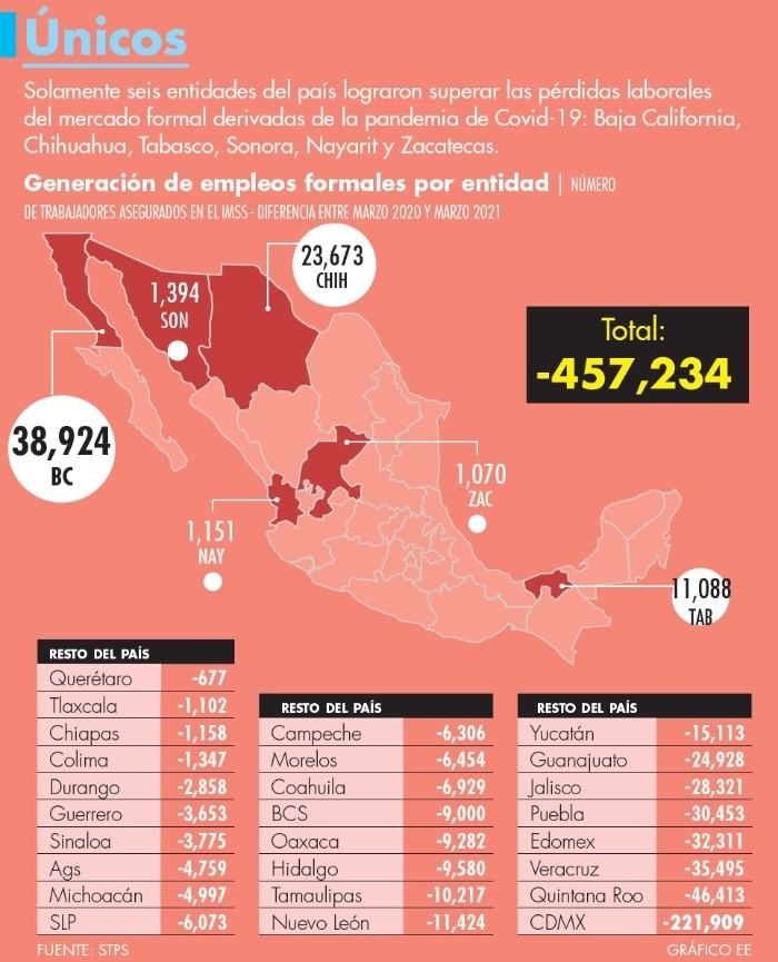 Únicamente seis entidades del país lograron superar las pérdidas laborales del mercado formal que trajo consigo el COVID- 19: Baja California, Chihuahua, Tabasco, Sonora, Nayarit y Zacatecas.De acuerdo con datos de la Secretaría del Trabajo y Previsión Social, a nivel nacional la merma asciende a 457 mil 234 empleos al cierre de marzo de este año, ya que en el tercer mes del 2020 se registraron 20.48 millones de trabajadores asegurados en el Instituto Mexicano del Seguro Social (IMSS), frente a 20.03 millones en igual periodo del 2021.El estado con mayor generación de puestos formales es Baja California, único territorio con todos sus municipios en el programa federal de zona libre (IVA a 8%, ISR a 20%, aumento al doble del salario mínimo y homologación de los precios de combustibles con los de Estados Unidos).Al finalizar marzo del 2020, cuando se declaró por dos meses confinamiento total, la entidad industrial contaba con 916 mil 498 trabajadores asegurados, mientras en el mismo lapso del presente año la cifra llegó a 955 mil 422 personas, es decir, se dieron 38 mil 924 altas en el IMSS, colocándose como líder.La fortaleza de Baja California fue el conjunto de industrias de transformación (43 mil 383 empleos nuevos); le siguieron transportes y comunicaciones (mil 919), comercio (862) e industrias extractivas (19); las pérdidas se mostraron en la industria eléctrica y captación y suministro de agua potable (38), construcción (714), servicios sociales y comunales (776), actividades primarias (1,465) y servicios para empresas, personas y el hogar (4,266).La segunda posición corresponde a otra entidad fronteriza y que, por ende, responde directamente por su ubicación a la recuperación de la economía estadounidense: Chihuahua. Sus trabajadores asegurados en el IMSS pasó de 897 mil 260 a 920 mil 933 en un año, creándose 23 mil 673 plazas. Al igual que en Baja California, su bastión fue la manufactura (29 mil 937), mientras la debilidad se centró en servicios para empresas, personas y el hogar (-7 mil 416).En el tercer escalón se ubica Tabasco, una entidad petrolera que se ha visto beneficiada por la inyección de recursos federales en el sector energético (destaca la refinería de Dos Bocas). Su plantilla laboral creció de 173 mil 950 a 185 mil 038, dando un saldo positivo de 11 mil 088 puestos. El poderío del estado corresponde a la construcción (creación de 13 mil 256 plazas), y el talón de Aquiles, a servicios para empresas, personas y el hogar (destrucción de mil 349 trabajos).A estos estados le siguió Sonora, otra entidad de la frontera norte de México. En marzo del año pasado tenía 630 jmil 894 trabajadores asegurados, contra 632 mil 288 un año después, contratando a mil 394 empleados. La vulnerabilidad del estado fue, como en casi todo el país, en servicios para empresas, personas y el hogar (-7 mil 441), y el baluarte, industrias de la transformación (+5 mil 171).Completaron la lista Nayarit (de 151mil 593 a 152 mil 744; mil 151 altas en el IMSS) y Zacatecas (de 188 mil 089 a 189 mil 159; mil 070 trabajos nuevos).En el caso de Nayarit, fue uno de los tres estados, junto a Chiapas y Aguascalientes, que generó empleos en servicios para empresas, personas y el hogar (mil 203); la flaqueza fue la construcción (-867). Para Zacatecas, el mayor creador fue servicios sociales y comunales (mil 670) y el peor resultado, industrias extractivas (-mil105).En tanto, las entidades con menores despidos a un año de que inició la jornada nacional de sana distancia y que están más cerca de recuperar las pérdidas de empleos, son Querétaro (677 bajas), Tlaxcala (mil 102) y Chiapas (mil 158).Por su parte, la Ciudad de México sigue siendo la entidad con mayor merma laboral a causa del impacto negativo de la pandemia, al presentar un déficit de 221 mil 909 trabajadores en un año; otras pérdidas importantes se dieron en Quintana Roo (46 mil 413 despidos), Veracruz (35 mil 495), Estado de México (32 mil 311) y Puebla (30 mil 453).En la capital del país, motor económico nacional con 16.1% del Producto Interno de México, solamente tres de nueve sectores generaron empleos: servicios sociales y comunales (mil 942); industria eléctrica y captación y suministro de agua (414) y agricultura, ganadería, silvicultura, pesca y caza (263).Las pérdidas fueron en extractivismo, transporte, comunicaciones, construcción, comercio, transformación y hogar.