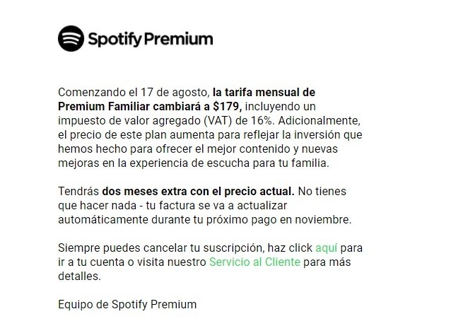 Debido al impuesto digital aprobado en México, diversas compañías han implementado paulatinamente el aumento en sus plataformas y esta vez toca el turno de Spotify.La plataforma de música en streaming publicó en su página oficial, todos los precios de sus diferentes suscripciones, los cuales incluyen un incremento en el coste para en México.De acuerdo con la firma, todos los nuevos precios serán aplicados a partir de este 17 de agosto para los nuevos suscriptores, sin embargo, en caso de contar con una suscripción activa, los usuarios de la plataforma contarán con dos meses más para disfrutar el precio anterior, por lo que hasta el próximo mes de noviembre, tendrán que pagar la nueva tarifa.Los nuevos precios de Spotify Premium en México son: Plan Universitario: 57 pesos al mes Plan individual: 115 pesos al mes Plan Duo: 149 pesos al mes Plan Familiar: 179 pesos al mesCabe señalar que, desde el pasado primero de junio, entró en vigor el IVA e ISR digital en México.jb