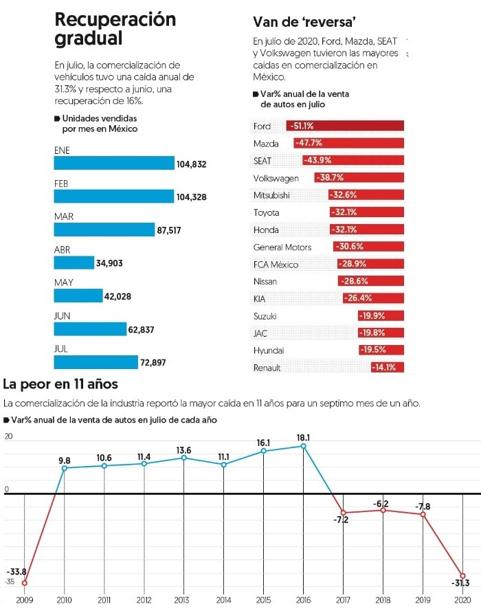 En el sexto mes del año se colocaron en México 72 mil 897 automóviles, un aumento de 16 por ciento en comparación con las 62 mil 837 unidades vendidas en junio pasado, informó el INEGI. Se trata del tercer mes consecutivo con variaciones positivas desde abril cuando comenzó la crisis económica por la pandemia de coronavirus en México. En mayo, junio y julio la comercialización de vehículos creció 20.4, 59.5 y 16 por ciento respectivamente, esto en comparación con el mes inmediato anterior, lo que confirma la tendencia de recuperación de la industria de armado en México. Guillermo Rosales, director general adjunto de la Asociación Mexicana de Distribuidores de Automotores (AMDA), señaló que aún afecta la suspensión de actividades en algunos pisos de venta, así como por la crisis económica que aumentó por la emergencia sanitaria. “El deterioro de la confianza empresarial y de los consumidores se encuentra en niveles bajos desde que se lleva registro, así como la pérdida de empleos, con lo que el entorno continuará siendo negativo”, advirtió Rosales. A pesar de la tendencia de recuperación, cabe destacar que el alza de 16 por ciento es la variación positiva más baja para este año. Rosales explicó que la desaceleración de la variación porcentual respecto al mes inmediato anterior se debe a que la base de comparación es mayor cada mes, toda vez que en mayo se vendieron 42 mil 28 unidades, en junio 62 mil 837 y en julio las 72 mil 897 anunciadas. Acotó que se siguen generando cifras positivas en la industria, gracias a la reapertura de las agencias, los fuertes incentivos de fabricantes y distribuidores, las tasas de interés y plazos atractivos en las ofertas de financiamiento y la satisfacción de demanda rezagada durante la contingencia. “Adicionalmente las ventas de flotilla han mostrado comportamiento favorable”, comentó. En cifras anualizadas, en julio de este año se vendieron 31.3 por ciento menos unidades que lo reportado en igual mes de 2019, siendo la mayor caída que reporta la industria desde la crisis económica de 2009. Esto es positivo, porque durante el segundo trimestre de 2020, la industria había reportado –en comparativos anualizados– caídas más grandes a las registradas durante la crisis de hace 11 años, y ahora la variación no fue tan negativa con respecto a ese periodo. Ford es la marca de volumen con la mayor baja en ventas con 51.1 por ciento, le sigue Mazda con 47.7 por ciento, luego SEAT con 43.9 por ciento y VW con 38.7 por ciento. En participación de mercado, Nissan se mantiene como líder con 20.2 por ciento, le sigue General Motors con 16.5 por ciento, luego está el Grupo Volkswagen (que incluye las marcas Audi, SEAT, Volkswagen, Bentley y Porsche) con 13.1 por ciento y en cuarto lugar con 8.6 por ciento. En cifras acumuladas entre enero y julio de 2020 se vendieron en México 509 mil 342 autos, cifra 31.8 por ciento inferior a lo registrado en el mismo lapso del año pasado, siendo la mayor caída desde 1995. Plantas, casi al 100 % Sobre la reactivación de las plantas ensambladoras en México tras la suspensión que sufrieron entre abril y mayo por la pandemia de coronavirus, Guido Vildozo, gerente senior en análisis de venta de autos ligeros en América de la consultora IHS Markit, señaló que actualmente todas ya están trabajando, pero que será hasta finales de agosto que recuperen gran parte de su capacidad. En conferencia comentó que aún no están al 100 por ciento porque trabajan sólo con una fracción de sus turnos de trabajo. Resaltó que la fase de realineación de operaciones tras la pandemia se realizará en el último trimestre de 2020 o inicios de 2021, con lo cual se espera que la producción de autos se recupere en su totalidad en México hasta 2022. Advirtió que para cumplir las nuevas reglas de contenido regional del T-MEC y la aplicación de medidas para evitar el contagio de coronavirus, sus costos subirían hasta 7 por ciento.