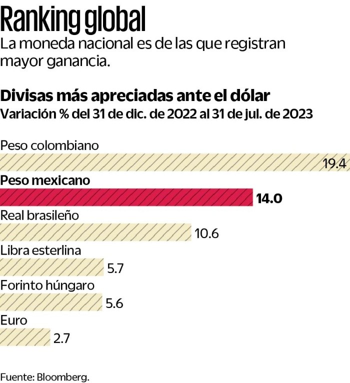 El superpeso reinará de aquí hasta 2025, según reflejó la encuesta que aplica cada mes el Banco de México (Banxico), en la que participaron 36 grupos de análisis y consultoría económica del sector privado nacional y extranjero. En la consulta del mes de julio, el consenso de especialistas recortó sus estimaciones para el tipo de cambio, colocándolo por debajo de 20 pesos, mientras que se deterioró ligeramente el panorama para las inversiones debido a problemas de inseguridad pública.Según la encuesta de Expectativas Económicas del banco central, el consenso estimó que el tipo de cambio podría cerrar este año en 17.90 pesos por dólar, desde 18.33 pesos que esperaba hace un mes. Para 2024 también ajustaron a la baja sus pronósticos, al pasar de 19.30 a 19 pesos por unidad, y lo mismo ocurrió para 2025, ajustando la proyección de 19.80 a 19.50 pesos por billete verde.La divisa mexicana en los mercados internacionales inició agosto ofreciéndose en 16.88 pesos por dólar al mayoreo, lo que significó una depreciación de 0.90% o 15 centavos respecto a la jornada anterior, luego de haber cerrado junio con una ganancia de 2.25%, de acuerdo con información de Bloomberg. Sin embargo, los especialistas mencionaron el nivel del tipo de cambio real como una preocupación, puesto que podría representar un obstáculo para la economía en cuanto a factores externos. Ubicaron en primer lugar factores coyunturales como la política monetaria en Estados Unidos, así como los niveles de tasas de interés externas y la economía mundial. Por el lado de los factores internos, pusieron en primer lugar la gobernanza, con 57%, como principal limitante para la economía; a su interior, los problemas de inseguridad pública, que pasaron de representar 20% a 24% de las respuestas recibidas.En tanto, la incertidumbre política interna subió de 6% a 9%, y entre las condiciones económicas internas destacó el repunte de 7% a 9% de la ausencia de cambio estructural. De ahí que no modificaron el pronóstico de crecimiento para la economía para 2024, al quedar en 1.50%, en tanto que para el presente año mejoró de 2.3% a 2.5%, todavía lejos del nivel de 3% que prevé la Secretaría de Hacienda.Para 2025 conservaron la expectativa de crecimiento de 2% que tenían, y para los próximos 10 años subió de 2.11% a 2.16%. En materia laboral, los especialistas anticipan 635 mil registros de trabajadores en el IMSS para este año, es decir, 35 mil más sobre lo que consideraban hace un mes; para 2024 mantuvieron los 550 mil posibles nuevos empleos generados.En materia de precios, persiste la tendencia descendente para la inflación general, pasando de 4.67% a 4.60% para el cierre de este año, con una tasa subyacente de 5.20%, desde el nivel de 5.26% en la encuesta pasada. Sin embargo, para la subyacente repuntó la estimación de 2024 de 4.11% a 4.13%, mientras que disminuyó marginalmente de 4.05% a 4.03% en la inflación general, según el consenso de analistas.Dentro de ese contexto, la tasa de fondeo que anticipan para el fin de año sigue siendo la misma, de 11%, y de 8.50% para el próximo año. La encuesta mostró que empeorará el clima de negocios en los próximos seis meses, de acuerdo con 38% de los encuestados, frente a 34% que así lo manifestó en el ejercicio pasado. Por lo tanto, subió de 34% a 35% el porcentaje de quienes aseguran que es mal momento para las inversiones, aunque se incrementó de 34% a 38% el de quienes dicen que es un buen momento.En línea con lo anterior, la expectativa para la inversión extranjera directa (IED) bajó de 35 mil 925 millones de dólares que preveían para el cierre de este año a 35 mil 229 millones de dólares. Lo mismo para la IED de 2024, aunque ligeramente, al pasar de 36 mil 326 millones a 36 mil 325 millones de dólares.