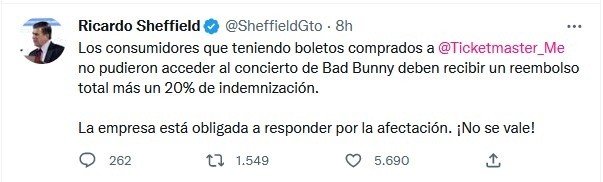 La Procuraduría Federal del Consumidor (Profeco) invitó a aquellas personas que han sido afectadas por Ticketmaster por el concierto de Bad Bunny o cualquier otro evento a sumarse a la acción colectiva contra esa empresa.La petición es para aquellos afectados "por Ticketmaster por la cancelación unilateral de la compra de tus boletos de cualquier evento de entretenimiento o por la negativa a la devolución del monto pagado".Profeco pidió a Ticketmaster reembolsarles a los consumidores el precio del boleto mas el costo de servicio, que es de 250 pesos, y sobre el pago total hecho darles un 20% a los afectados que no pudieron entrar a un concierto a pesar de tener un boleto legítimo.El titular de la Profeco, Ricardo Sheffield, publicó en Twitter: "Los consumidores que teniendo boletos comprados a @Ticketmaster_Me no pudieron acceder al concierto de Bad Bunny deben recibir un reembolso total más un 20% de indemnización. La empresa está obligada a responder por la afectación. ¡No se vale!"Por ello, la Profeco emitió un tuit en el que invita a los consumidores que han sido afectados por Ticketmaster a sumarse a la "acción colectiva", para lo cual les pidió llenar un formato que pueden descargar en https://accolectivas.profeco.gob.mx o llamar al 55 5625 6700 extensiones 11121, 11292, 11122, 11357 o 11176.Incluso la organización Tec-Check ofreció "apoyar a Profeco para defender colectivamente los derechos de la población consumidora y completar el trabajo de la Procuraduría".JM