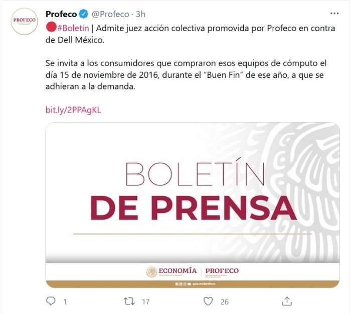 En 2016, durante la edición de "El Buen Fin", la empresa Dell ofreció por un error computadoras en 679 pesos, cuyo proceso de venta canceló y hoy la Procuraduría Federal del Consumidor (Profeco) informó que obligarán a que la empresa respete dicho precio.Lo anterior debido a que el Juzgado Séptimo de Distrito en Materia Civil de la Ciudad de México admitiera una acción colectiva de la Profeco en contra del proveedor Dell México.A través de este procedimiento jurídico, se pedirá a Dell respetar la oferta que hizo vía Internet para vender los modelos de laptop "Alienware 17 R4", "Alienware 15 R2", "XPS" e "Inspiron" a un precio desde 679 pesos.Por ello, la Profeco pidió a todos los que compraron en ese momento esos equipos de cómputo a que se adhieran a la acción colectiva.La Procuraduría expuso que los consumidores afectados viven principalmente en la Ciudad de México, Estado de México, Jalisco, Nuevo León, Morelos, Guanajuato, Aguascalientes, Tabasco, Yucatán, Oaxaca, Tamaulipas, Nayarit, Quintana Roo, Colima, Hidalgo, Sonora, Baja California, Veracruz, San Luis Potosí y Zacatecas."Los consumidores creyeron haber encontrado una oferta al comprar o intentar adquirir vía electrónica estos modelos de computadoras portátiles; sin embargo, la proveedora procedió a cancelar el proceso de venta con el argumento de que se trató de un error en la actualización de su página en Internet, por lo cual no podía cumplir con la oferta", se lee en el comunicado del orgnismo.Si alguien desea sumarse a la demanda colectiva, deberá presentar a la Dirección de Acciones Colectivas la siguiente documentación:JM