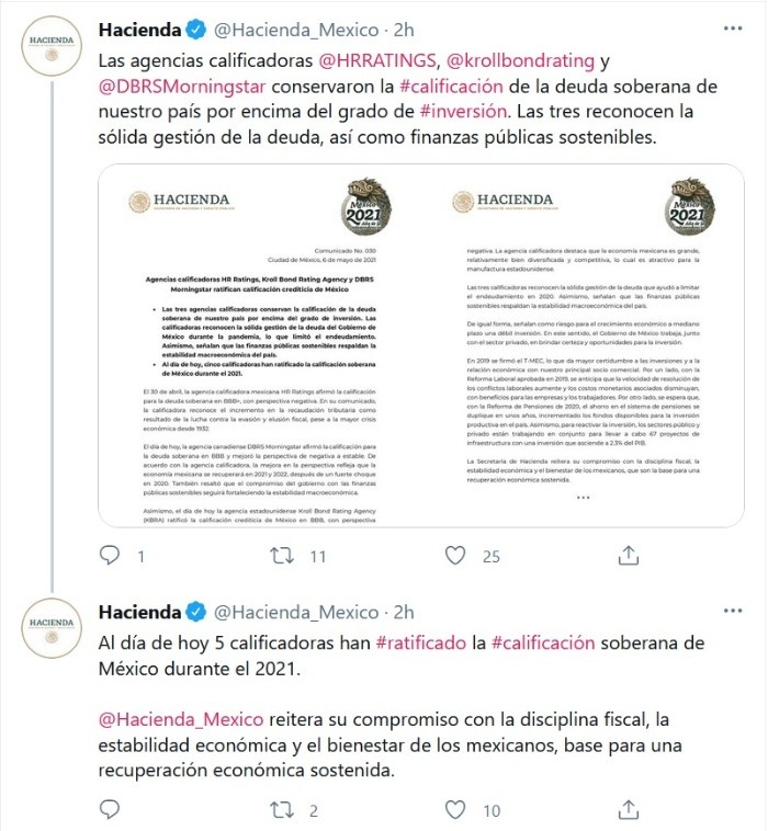 La Secretaría de Hacienda y Crédito Público (SHCP) informó que las agencias HR Ratings, Kroll Bond Rating Agency y DBRS Morningstar ratificaron la calificación crediticia de México."Las tres agencias calificadoras conservan la calificación de la deuda soberana de nuestro país por encima del grado de inversión"."Las calificadoras reconocen la sólida gestión de la deuda del Gobierno de México durante la pandemia, lo que limitó el endeudamiento. Asimismo, señalan que las finanzas públicas sostenibles respaldan la estabilidad macroeconómica del país", dijo la dependencia.Hacienda recordó que hasta el momento, cinco calificadoras han ratificado la calificación soberana de México durante el presente año.Hacienda detalló que el pasado 30 de abril, la agencia mexicana HR Ratings afirmó la calificación para la deuda soberana en BBB+, con perspectiva negativa."La calificadora reconoce el incremento en la recaudación tributaria como resultado de la lucha contra la evasión y elusión fiscal, pese a la mayor crisis económica desde 1932", detalló.Por su parte, la agencia canadiense DBRS Morningstar afirmó este jueves la calificación para la deuda soberana en BBB y mejoró la perspectiva de negativa a estable."De acuerdo con la agencia calificadora, la mejora en la perspectiva refleja que la economía mexicana se recuperará en 2021 y 2022, después de un fuerte choque en 2020. También resaltó que el compromiso del gobierno con las finanzas públicas sostenibles seguirá fortaleciendo la estabilidad macroeconómica", dijo.En tanto, también este jueves, la agencia estadounidense KrollBond Rating Agency (KBRA) ratificó la calificación crediticia de México en BBB, con perspectiva negativa. La agencia calificadora destaca que la economía mexicana es grande, relativamente bien diversificada y competitiva, lo cual es atractivo para la manufactura estadounidense."Las tres calificadoras reconocen la sólida gestión de la deuda que ayudó a limitar el endeudamiento en 2020. Asimismo, señalan que las finanzas públicas sostenibles respaldan la estabilidad macroeconómica del país", explicó.JM
