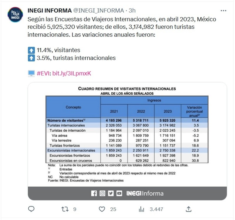 México recibió en abril pasado un 3.5 % más de turistas internacionales que en el mismo mes de 2022, aunque el ingreso de divisas por este rubro decreció un 1.9 %, informó este viernes el Instituto Nacional de Estadística y Geografía (Inegi).Al país ingresaron 3.17 millones de turistas extranjeros en el cuarto mes de 2023, comparado con los 3.06 millones del mismo lapso del año anterior, según el informe del organismo autónomo.El principal repunte anual sucedió en los turistas fronterizos, que en abril de 2023 crecieron un 18.6 % hasta superar las 1.51 millones personas, mientras que aquellos que llegaron por avión se redujeron en 5.2 % a 1.71 millones. Por otro lado, en abril de 2023, el gasto total de los turistas internacionales disminuyó un 1.9 % interanual al pasar a dos mil 232.1 millones de dólares desde una cifra previa de dos mil 274.2 millones de dólares.Asimismo, el gasto medio de cada turista decreció un 5.2 % hasta los 703 dólares en abril comparado con los 741.33 dólares del cuarto mes de 2022.Los datos reflejan una ralentización de la tendencia al alza del turismo en México, que tuvo 38.3 millones de turistas internacionales durante 2022, un 20.3 % más que en 2021.El ingreso de divisas por visitantes internacionales el año pasado fue de 26 mil 346.9 millones de dólares, más del 42 % que un año antes.La economía relacionada con el turismo en México, que el Inegi llama Producto Interno Bruto (PIB) turístico, creció un 14.4 % en 2022. JM