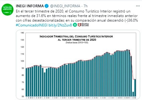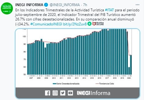 El turismo en México mostró un aumento productivo de 26.7% entre julio y septiembre del año pasado frente al trimestre inmediato anterior, más del doble que el conjunto de la economía nacional, por la reapertura de actividades tras finalizar la Jornada Nacional de Sana Distancia.Mientras el Producto Interno Bruto (PIB) nacional repuntó 12% durante esos tres meses, la actividad turística se recuperó 27%, de acuerdo con la variación trimestral de los indicadores del sector que el Instituto Nacional de Estadística y Geografía (Inegi) dio a conocer esta mañana.Pese a ello, la recuperación no logró compensar el desplome histórico de 44% que sufrió entre abril y junio de 2020, luego de las medidas restrictivas para frenar los contagios de COVID-19 en el país y por el menor ingreso disponible de las familias y empresas ante la recesión mundial.Los resultados del sector responden a que las actividades de servicios, mismas que aportan ocho de cada 10 pesos del PIB turístico, aumentaron 22% entre julio y septiembre, después de tres trimestres consecutivos en rojo.Los servicios turísticos se refieren al transporte, alojamiento, restaurantes, comercio, segundas viviendas y tiempos compartidos, entre otros.Al mismo tiempo, la producción de bienes turísticos, como la fabricación de artesanías y prendas de vestir, presentó un incremento de 46%, luego de que también registrara tres trimestres a la baja."A pesar de haber experimentado una importante recuperación con respecto al trimestre previo, en comparación interanual, la profunda caída del PIB turístico en el tercer trimestre muestra la gravedad de la situación que sigue enfrentando el turismo mexicano", señaló esta mañana el Centro de Investigación y Competitividad Turística (Cicotur) de la Universidad Anáhuac.En su comparación anual (con el tercer trimestre de 2019), la actividad turística perdió una tercera parte de su valor tras desplomarse 34.2% entre julio y septiembre de 2020, según las cifras del Inegi.El próximo 13 de mayo, el Inegi dará a conocer los Indicadores Trimestrales de la Actividad Turística correspondientes al cuarto trimestre de 2020.Los establecimientos productores de bienes y servicios turísticos, como hoteles, aerolíneas y agencias de viaje, borraron casi 290 mil empleos turísticos durante 2020, de acuerdo con datos del Inegi retomados por la Secretaría de Turismo (Sectur).Esta es la primera vez que el empleo turístico disminuye en el país desde que hay información comparable, a partir de 2006.Los empleos turísticos que se perdieron el año pasado equivalen a la población conjunta de seis de los 11 municipios de Quintana Roo, el estado más golpeado por la crisis del sector.Cozumel, Felipe Carrillo Puerto, Isla Mujeres, José María Morelos, Lázaro Cárdenas y Puerto Morelos sumaron una población de 290 mil 559 personas, muestra el Censo de Población y Vivienda 2020 del Inegi.NR