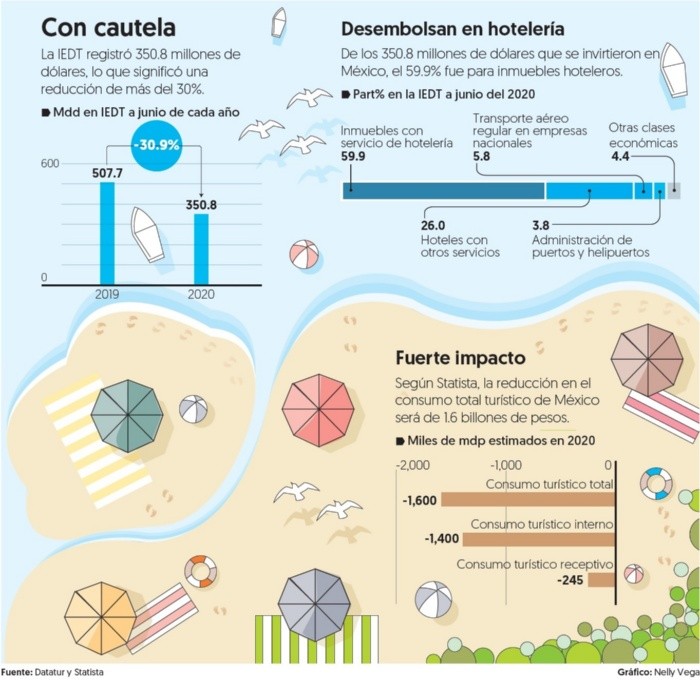 El coronavirus impactó a la Inversión Extranjera Directa Turística (IEDT), pues en el primer semestre (1S) de 2020 cayó 30.9 por ciento anual, comparado con la mitad del 2019.Según datos de la Secretaría de Turismo (Sectur), entre enero y junio, el país atrajo inversiones de capital extranjero, que se capitalizaron en hoteles, transporte aéreo y otros servicios relacionados, por 350.8 millones de dólares, lo que significó una pérdida de un tercio de la IED, respecto al primer semestre del año pasado, cuando se recibieron 507.7 millones de dólares.En la primera mitad de este año, México perdió 156.9 millones de dólares, que al tipo de cambio promedio de los primeros seis meses representa 3 mil 389 millones de pesos ‘borrados’ de proyectos, principalmente en oferta hotelera, con firmas como Iberostar, Grupo Xcaret, Posadas y NH que ajustaron sus planes en el país.La consultora Statista anticipó que para este año México registrará una caída relacionada con el consumo turístico total de aproximadamente 1.6 billones de pesos, mientras que la Secretaría de Turismo estimó la cifra en 1.9 billones de pesos, o alrededor de 101 mil 254 millones de dólares.El flujo de capital extranjero en la llamada ‘industria sin chimeneas’ proviene principalmente de la inversión en infraestructura hotelera, una de las más golpeadas por COVID-19, ya que los cuartos de hotel estuvieron cerrados por al menos 10 semanas.Hay proyectos en diversos polos turísticos que tuvieron que detenerse o fueron pospuestos indefinidamente por los grupos hoteleros que operan en México y que tenían sólidos planes de expansión en el país.La española Iberostar planeaba comenzar la construcción de su segunda propiedad en Riviera Nayarit, pero la pandemia forzó a aplazar indefinidamente el comienzo de la obra y paró la inversión de alrededor de 80 millones de dólares que se contemplaban para el hotel de 300 habitaciones en la zona de Litibú.“Sigue en pie la segunda propiedad, no nos han dado fecha de cuándo planean comenzar la construcción, porque las condiciones para el Grupo (Iberostar) no son buenas en España, sin embargo, el primer hotel en Playa Mita ha tenido muy buena ocupación”, señaló a este diario Richard Zarkin, gerente de relaciones públicas de la OCV de Riviera Nayarit.Zarkin agregó que otros desarrollos como el de Vidanta, de 600 habitaciones, el Auberch, además de un Ritz- Carlton, siguen en pie, aunque con ligeras modificaciones en sus planes de apertura debido a las condiciones de la crisis sanitaria.Grupo Xcaret es otra de las empresas que también tuvo que ajustar su plan de expansión y recorrió la inauguración de su hotel boutique para 2022.“El que sí se detuvo y se va a posponer un año es el hotel boutique, Casa de la Playa, se va a pasar para 2022 su apertura, igual que el parque Xibalbá, que es el nuevo, es un parque que está en Yucatán, cerca de Valladolid, no hay fecha, pero se va a posponer”, dijo Zakari Malinen, director de ventas de Hoteles Xcaret.Señaló que los planes de expansión, que contemplan una inversión de 400 millones de dólares para los siguientes ocho años, no tendrán modificaciones en el monto, sino que se recorrerán dependiendo del avance de la reactivación en el país.Grupo Posadas decidió concentrar sus recursos en la promoción de mercados ya conocidos, en lugar de expandirse conforme a su plan establecido.“La activación económica de los negocios de viajes y de placer es aún incierta. La compañía decidió concentrar sus recursos en la promoción y posicionamiento de sus marcas en mercados conocidos. Se llegó a un acuerdo para terminar anticipadamente los contratos de los hoteles Fiesta Americana Punta Varadero y Fiesta Americana Costa Verde”, comentó Grupo Posadas.En el periodo de la crisis sanitaria, Posadas se desprendió de la operación de 2 mil 555 cuartos, el 8 por ciento de su oferta antes de la pandemia.La hotelera NH también detuvo su plan de inversión en México y en América Latina por las complicaciones que ocasionó el coronavirus, pues en el segundo trimestre, paró proyectos de expansión, que en septiembre se analizaron de nuevo para ajustar los costos de inversión y los periodos de apertura.“Los proyectos que teníamos en cartera nos estamos reuniendo con nuestros socios porque queremos hacer un recálculo en el calendario de aperturas y en cuanto a la inversión, porque se están moviendo los costos y el calendario”, dijo Christian José Daghelinckx, managing director para América de la compañía hotelera, a El Financiero.El directivo de NH recalcó que, pese a la revisión de proyectos de expansión con los inversionistas, México es uno de los ‘punteros’ en cuanto a propuestas de nuevos hoteles.Por su parte, Virginia Messina, directora general del Consejo Mundial de Viajes y Turismo (WTTC), dijo que la pandemia marca un momento de oportunidades para repensar la inversión turística y pensar en modelos innovadores para la construcción de hoteles.