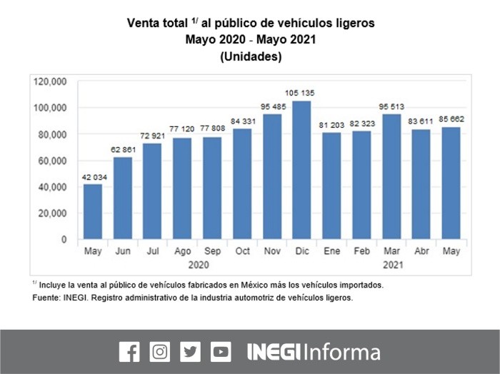 El Instituto Nacional de Estadística y Geografía (Inegi) informó que el mes pasado la venta de vehículos ligeros nuevos fue de 85 mil 662 unidades, cifra que representa un aumento del 103% en comparación al número de unidades comercializadas en mayo de 2020, cuando las agencias automotrices estaban cerradas debido a las medidas implementadas para evitar contagios por COVID-19.Según las cifras del Inegi dadas a conocer esta mañana, la venta de autos nuevos respecto a abril registró un crecimiento de 2.5%. Mientras que en el acumulado enero-mayo, se vendieron 428 mil 312 autos nuevos, lo que representa un incremento de 14%, respecto al mismo periodo de 2020.Con estas cifras, el mercado de vehículos ligeros en mayo se ubicó cerca de la expectativa de los distribuidores, la cual se ubicó en 82 mil 445 unidades, mostrando una diferencia porcentual de -3.7% con respecto al dato observado, indicó Guillermo Rosales, director general adjunto de la Asociación Mexicana de Distribuidores de Automotores (AMDA)."El resultado de mayo, como anticipamos, refleja un avance importante dada su comparativa con el mes de mayo del año anterior, mismo que registró el segundo mayor impacto en 2020 por efecto de la pandemia, cuya caída entonces fue del orden del 59%."Esta situación explica el avance a triple dígito en este mes, cuyo nivel se ha situado conforme a la expectativa, validando hacia los próximos meses un avance moderado en el mercado interno que pueda cerrar el año con alrededor de un millón 53 mil unidades, es decir, con un 11% de avance respecto a 2020", explicó Rosales.Casi todas las automotrices reportaron un crecimiento a triple dígito en ventas durante mayo. Las de mayor volumen de venta: Nissan, General Motors, Volkswagen, Toyota y KIA registraron aumentos de 95%, 108%, 176%, 71% y 139%, respectivamente.Entre las marcas de lujo, BMW incrementó 111% sus ventas; Mercedes Benz 9.5%; Audi 226%, Volvo 307%, Land Rover 243%; Subaru 171%; Acura 226%; Jaguar 550%; y Porsche 111%.AMDA agregó que, no obstante el avance registrado en mayo y el acumulado de los primeros cinco meses del año, los elementos de riesgo continúan presentes para el mercado interno: la problemática global que ha impactado la disponibilidad de semiconductores y el incremento que registran los índices de precios tanto el general de 6%, como de vehículos con 9%, con datos al corte de la primera quincena de mayo de 2021.En cuanto a los elementos positivos de impulso económico, AMDA indicó que se anticipa un mejor desempeño del Producto Interno Bruto para el país, que conforme a la encuesta de expectativas de Banco de México sería de 5.1% reflejando un incremento contra el pronóstico del mes anterior de 4.8%.Asimismo, por tercer mes consecutivo se registra un avance anual en la confianza empresarial del orden de 44% en sector manufacturero y de 58% en equipo de transporte.NR