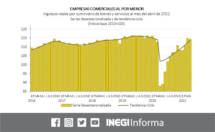 Este miércoles, el Instituto Nacional de Estadística y Geografía dio a conocer que las ventas minoristas reportaron un retroceso mensual de 0.4% en abril.Esta es la primera baja desde junio de 2020 cuando las ventas al menudeo iniciaron su recuperación, luego del desplome registrado debido a las medidas implementadas para frenar contagios por COVID-19 en los primeros meses del año pasado.De acuerdo con los datos más recientes publicados por el Inegi, de manera desagregada, cinco de sus nueve grandes componentes reportaron un retroceso, entre los que destaca el segmento de alimentos y bebidas que registraron una caída mensual de 2.5%, el cual que tiene un peso de 13% respecto al total de las ventas al menudeo, explicó Daniel Arias, analista económico de Monex.A nivel de subcomponentes, fueron 11 de 22 los que presentaron cifras negativas, destacando la caída de 6.3% de las ventas por internet, que tuvieron su peor desempeño desde el inicio de la pandemia, mostrando el cambio de preferencias en los canales de consumo tras la reapertura de las tiendas físicas.Por su parte, debido al efecto de la base de comparación, la tasa anual presenta un alza sustancial de 29.7%, que es la más abultada de todo el registro histórico y refleja los contrastes entre la abrupta caída que el indicador sufrió en abril y el rápido ritmo de recuperación que ha experimentado en los meses posteriores.A pesar de las cuantiosas tasas anuales y de la contracción mensual, la situación cambia poco respecto al pasado inmediato, pues la mayoría de los ramos se mantienen cerca, pero por debajo, de sus niveles pre-crisis, comentó Arias.Solo nueve de los 22 subcomponentes presentan recuperación y la mayoría se concentran en categorías de bajo peso, como los enseres domésticos o los artículos de ferretería. La excepción a este comportamiento son las tiendas de autoservicio que acumulan un crecimiento de 5.7% respecto a los niveles de mayo de 2019 y reflejan la resiliencia del consumo, agregó el especialista.Al igual que en otros países, las ventas minoristas en México han perdido impulso luego de un muy buen arranque de año. Lo anterior puede deberse tanto a una reorientación del gasto hacia los sectores de servicios, como a una menor base ingreso respecto a los meses inmediatos anteriores, advirtió Daniel Arias.NR