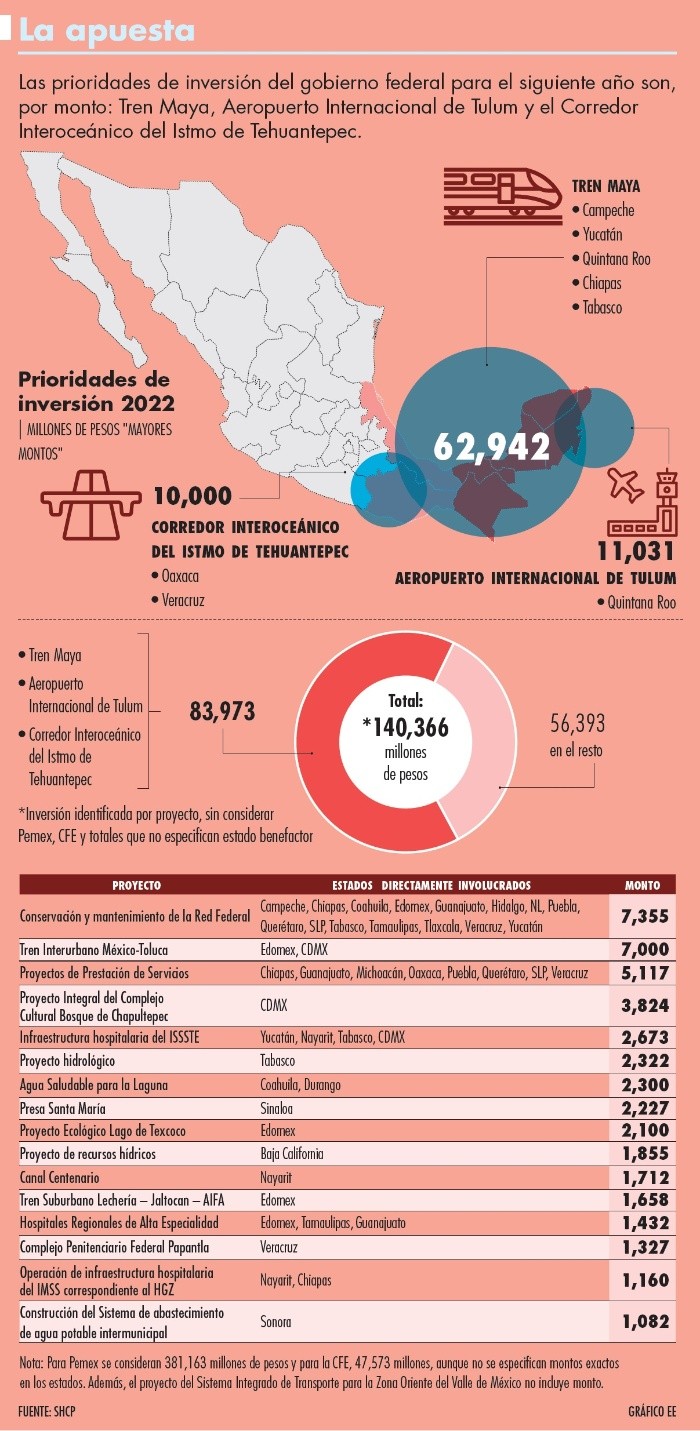 Las entidades más beneficiadas por las obras de inversión registradas en el Proyecto de Presupuesto de Egresos de la Federación (PPEF) 2022 son Veracruz, Estado de México, Oaxaca y Tabasco.Mientras los estados de Colima, Morelos, Aguascalientes, Baja California Sur, Zacatecas y Jalisco no están considerados como prioridades de grandes obras por parte del gobierno federal para el próximo año.De acuerdo con el apartado Prioridades de inversión 2022 de la Exposición de motivos del PPEF, el Gobierno de México considera necesario que los proyectos de inversión fomenten la movilización de recursos en el contexto de la pandemia de COVID-19, y “más ampliamente, su función complementaria en la generación de empleos con salarios dignos para lograr la reactivación económica”.Es decir, una prioridad de inversión permitirá continuar con la recuperación de la estabilidad macroeconómica de las regiones del país.En este contexto, se identificó que una de las entidades más beneficiadas por el número de proyectos que ostenta en el rubro de Prioridades de inversión 2022 es Veracruz. Por ejemplo, aparece, junto a Oaxaca, en una de las obras emblemáticas de la Federación, el Corredor Interoceánico del Istmo de Tehuantepec, que para el próximo año se prevén recursos por 10 mil millones de pesos.Desarrollo mexiquenseEl Estado de México es otra prioridad de inversión en el PPEF 2022. Los proyectos emblemáticos son el Tren Interurbano México-Toluca (7mil millones de pesos estimados para el siguiente año; incluye a la capital), Proyecto Ecológico Lago de Texcoco (2 mil 100 millones), Tren Suburbano Lechería – Jaltocan – AIFA ( mil 658 millones) y el Aeropuerto Internacional “Felipe Ángeles” (800 millones).Además, se considera a la entidad en la conservación y mantenimiento de la Red Federal (Texcoco – Zacatepec) y Proyectos de Prestación de Servicios (Pirámides – Tulancingo – Pachuca), así como en Hospitales Regionales de Alta Especialidad, junto con Tamaulipas y Guanajuato, con un total de mil 432 millones de pesos entre los tres estados.DetonadoresOaxaca y Tabasco son los otros emblemas de inversión del gobierno federal para el 2022, según el número de apariciones en los proyectos del apartado Prioridades de inversión 2022 de la Exposición de motivos del PPEF.Además de estar en las obras referidas junto con Veracruz, como el Corredor Interoceánico del Istmo de Tehuantepec y la carretera Acayucan - La Ventosa, Oaxaca se manifiesta en los Proyectos de Prestación de Servicios correspondientes a los tramos Mitla- Tequisistlan-Entronque Tehuantepec II y Tapachula-Talismán con ramal a Ciudad Hidalgo (junto con Chiapas y Puebla).Se prevé la ampliación de la carretera Puerto Escondido Huatulco (524 millones de pesos programados) y la asignación de 100 millones para la modernización de 25.7 kilómetros de la carretera en Zona Amuzgos para los habitantes de los estados de Oaxaca y Guerrero.En el caso de Tabasco, su detonación correría a mano del Tren Maya (con Campeche, Yucatán, Quintana Roo y Chiapas), proyecto insignia de la administración de Andrés Manuel López Obrador, con 62,942 millones previstos para el siguiente año.Los otros territorios insignia de la FederaciónOtras entidades que repiten constantemente en las Prioridades de inversión 2022 del PPEF son Chiapas, San Luis Potosí, Ciudad de México, Nayarit y Sinaloa.Los proyectos que sobresalen son el Tren Maya y la ampliación de la carretera Palenque - San Cristóbal (770 millones de pesos) para Chiapas; el nuevo campus de la Universidad Politécnica de San Luis Potosí (230 millones) y la modernización de la carretera Portezuelo - Ciudad Valles – Tamazunchale (975 millones) para el territorio potosino; las obras de movilidad y el proyecto integral del Complejo Cultural Bosque de Chapultepec (3 mil 824 millones) para la capital del país.La construcción del camino de acceso a las universidades en zonas indígenas de la Yesca -Presa del Cajón - Carretones - Aserradero de las Palas - Guadalupe Ocotán- (283 millones) y la modernización del tramo Carretones - Mesa de Pajaritos – Camotlán (430 millones) para Nayarit, y la construcción de la Presa Santa María (2 mil 227 millones) para Sinaloa.El restoEn tanto, los estados menos beneficiados en las Prioridades de inversión 2022 serían Baja California, Chihuahua y Tlaxcala, cada uno con sólo una mención en el apartado referido, es decir, el ranking no se realizó por monto.Para Baja California se prevé un proyecto de recursos hídricos por mil 855 millones de pesos presupuestados; para Chihuahua la terminación de la carretera Badiraguato–Parral por 338 millones, que comparte con Sinaloa, y para Tlaxcala la conservación y mantenimiento de la carretera Texcoco – Zacatepec, que incluye a Puebla y Estado de México.Por último, Colima, Morelos, Aguascalientes, Baja California Sur, Zacatecas y Jalisco no aparecen en las Prioridades de inversión 2022 de la Exposición de motivos del PPEF.Si te interesó esta noticia y quieres saber más, entonces descarga y descubre INFORMAPlus, la aplicación digital de EL INFORMADOR, en donde tenemos contenidos exclusivos, seleccionados por nuestros editores, para darles una experiencia más completa a los lectores.Descarga la aplicación y pruébala GRATIS por treinta días.Para iOS: https://apple.co/35jaVgb Para Android: https://bit.ly/3gwVSEVSi eres suscriptor de EL INFORMADOR tu acceso está incluido, solicítalo al 33 3678-7777.